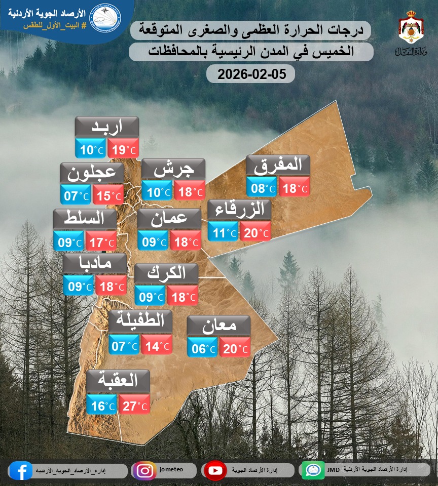 قالت إدارة الأرصاد الجوية – 04/02/2026 انه تُشير التوقعات الصادرة عن إدارة الأرصاد الجوية إلى ارتفاع ملموس على درجات الحرارة يوم الخميس لتسجل أعلى من معدلاتها العامة لمثل هذا الوقت من السنة بحوالي (5–6) درجات مئوية، حيث يكون الطقس غالباً مشمساً، وبارداً نسبياً فوق المرتفعات الجبلية، ولطيف الحرارة في مناطق البادية والسهول، فيما يكون دافئاً في الأغوار والبحر الميت والعقبة، مع تحذيرات من تشكل الضباب صباحاً في المرتفعات الشمالية والغبار في مناطق البادية.