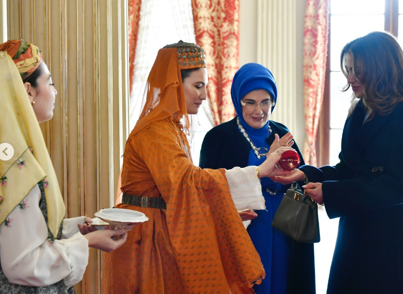 وبعد استقبال السيدة الأولى لجلالة الملكة في قصر دولمة بهجة، قامت جلالتها والسيدة الأولى بجولة في معرض فني تراثي يقام حالياً في القصر يبرز منسوجات وتطريزات تركية تقليدية. وتضم المعروضات أعمالاً تعكس دور الفنون التقليدية في تشكيل الهوية الثقافية.