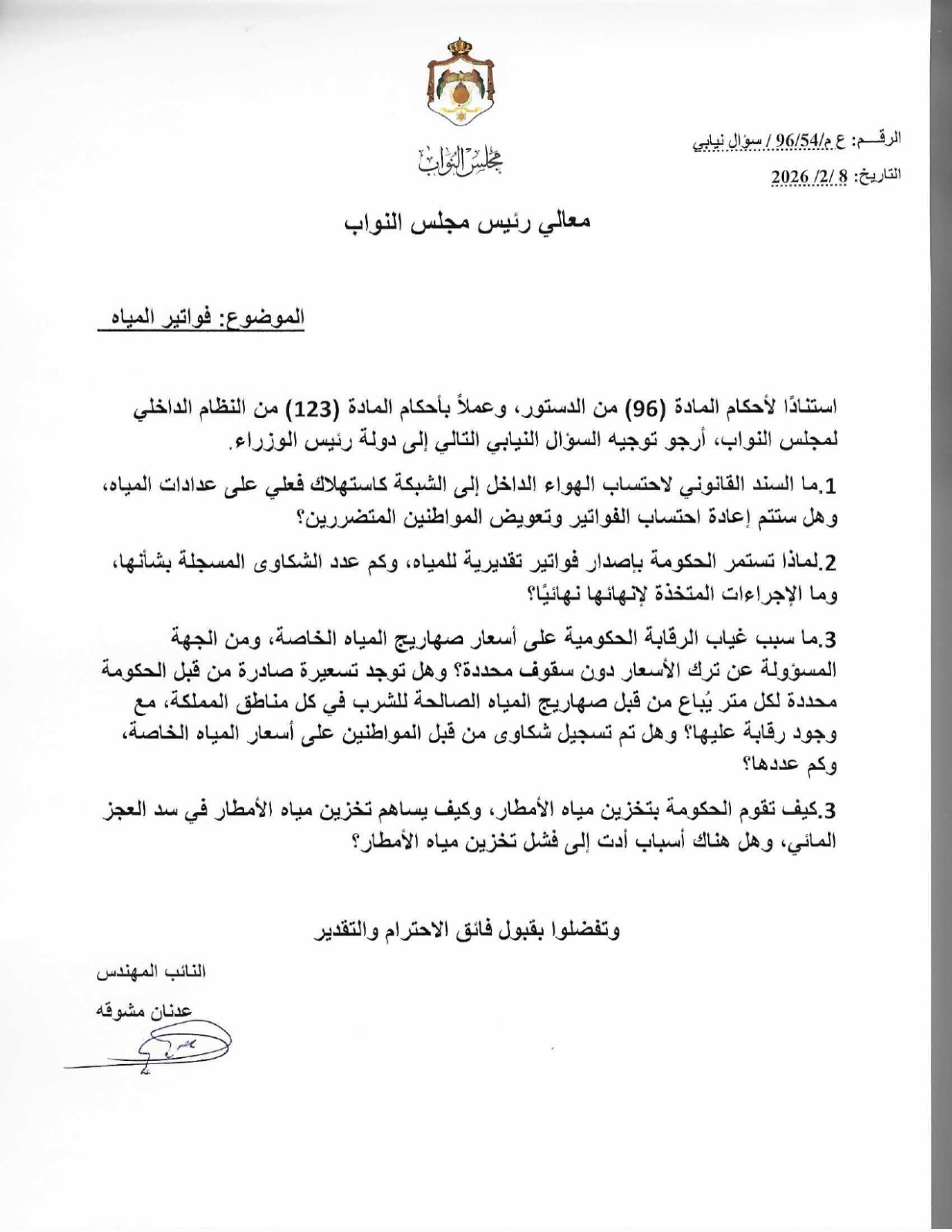 2.لماذا تستمر الحكومة بإصدار فواتير تقديرية للمياه، وكم عدد الشكاوى المسجلة بشأنها، وما الإجراءات المتخذة لإنهائها نهائيًا؟
