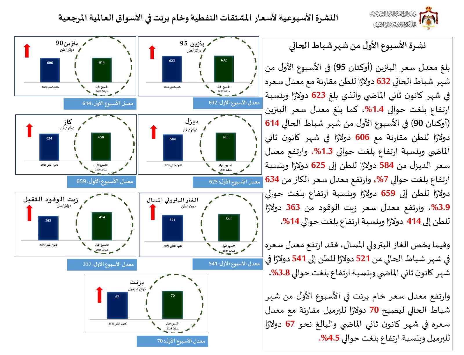 تاليا النشرة الأسبوعية لأسعار النفط الخام برنت ومشتقاته حسب الأسواق المرجعية للأسبوع الأول من شهر شباط 2026