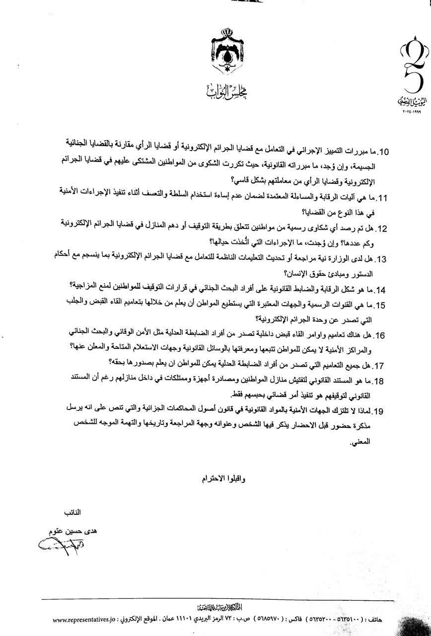 كما طالبت النائبة بالكشف عن عدد الشكاوى الرسمية المقدمة من مواطنين حول طريقة التوقيف أو دهم المنازل في قضايا الجرائم الإلكترونية، والإجراءات التي اتُّخذت حيالها، إلى جانب الاستفسار عن نية الوزارة مراجعة أو تحديث التعليمات الناظمة لهذه القضايا بما ينسجم مع أحكام الدستور ومبادئ حقوق الإنسان.