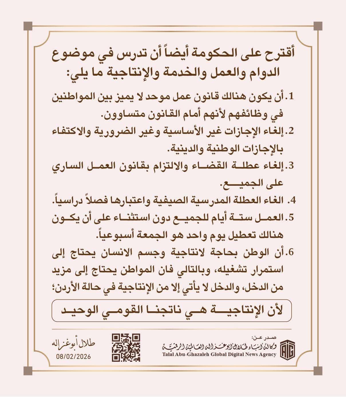 تعليقاً على المقترح الحكومي بزيادة مدة العطلة الأسبوعية إلى 3 أيام، نشر رجل الأعمال والعين الأسبق، طلال أبو غزالة، تعقيباً على هذا المقترح.
