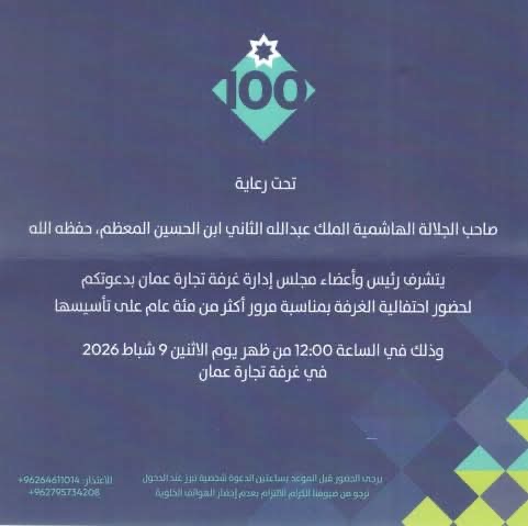 مائة عام من العطاء، كانت فيها الغرفة ركيزة أساسية في بناء اقتصادنا الوطني ودعم القطاع التجاري. فخورون بهذا الإرث العريق، ومستمرون بالعمل تحت ظل القيادة الهاشمية نحو مستقبل اقتصادي مشرق ومستدام.