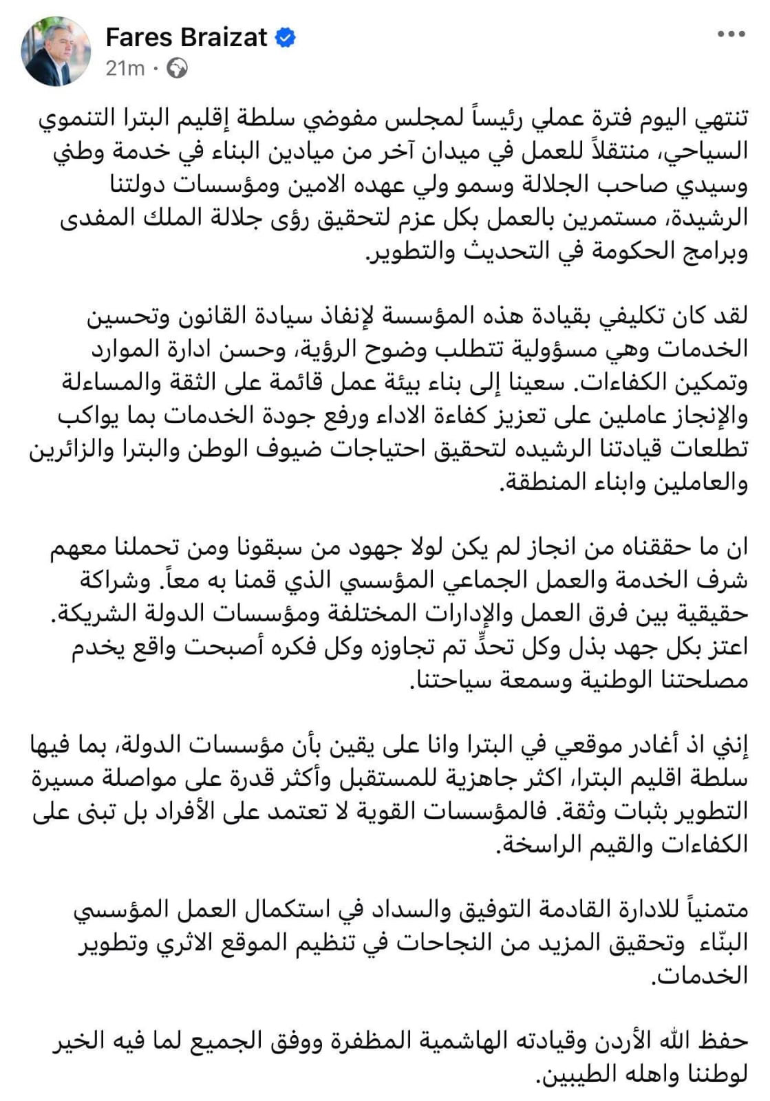 بالعربي والإنجليزي، نشر فارس بريزات خبر انتهاء عمله كرئيسٍ لمجلس مفوضي سلطة إقليم البترا التنموي السياحي، مؤكداً أنه سينتقل للعمل في ميدانٍ آخر في خدمة الوطن، دون أن يفصح عن المكان الجديد الذي سينتقل إليه.