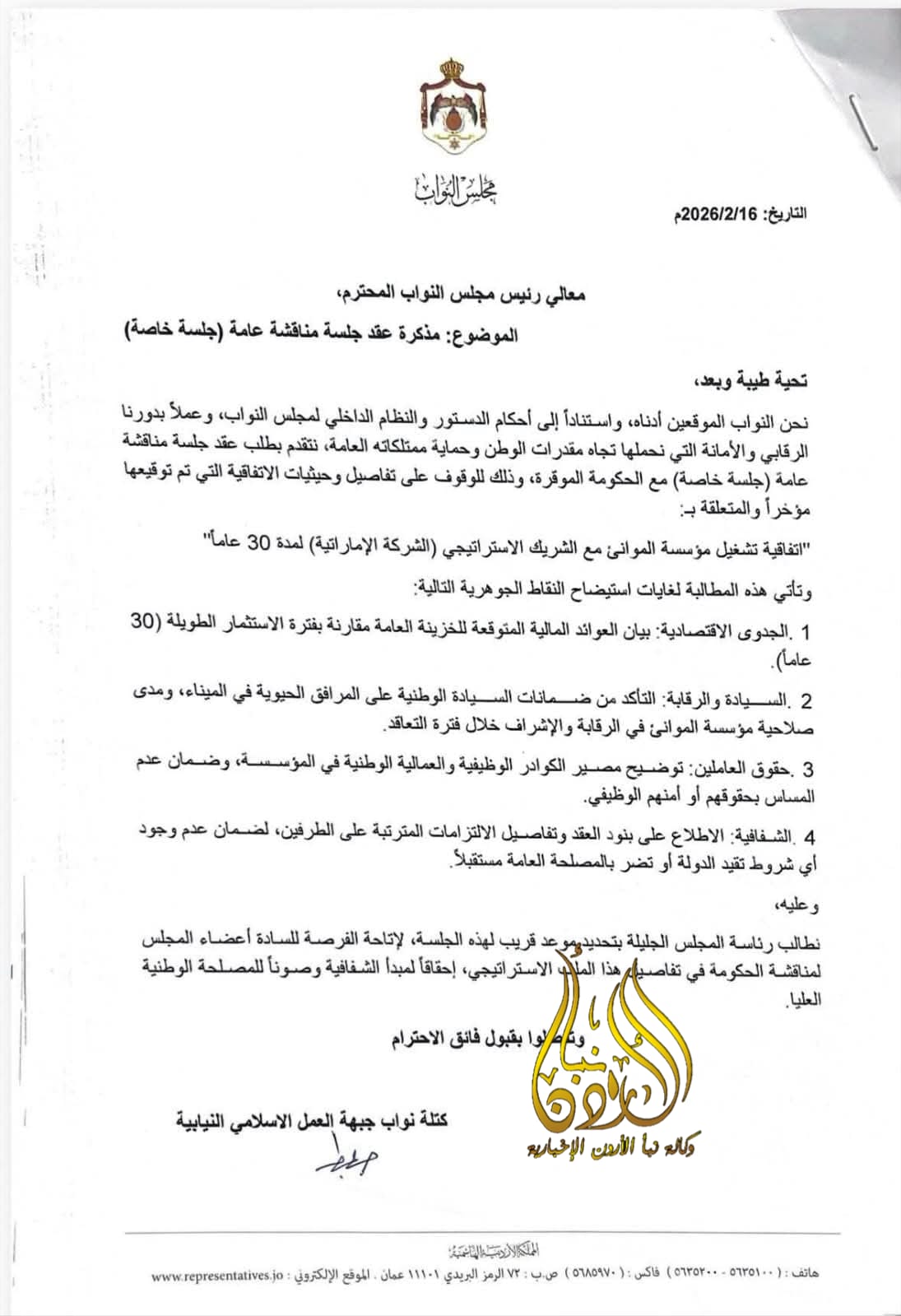 تقدمت كتلة جبهة العمل الإسلامي بمذكرة نيابية تطالب فيها بعقد جلسة خاصة مع الحكومة لمناقشة اتفاقية تشغيل مؤسسة الموانئ مع الشريك الاستراتيجي لمدة ثلاثين عامًا.