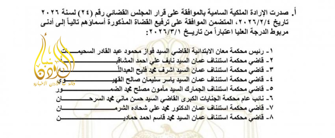 صدر في عدد الجريدة الرسمية اليوم الخميس، الإرادة الملكية السامية بالموافقة على ترفيع 8 قضاة إلى أدنى مربوط الدرجة العليا اعتبارا من تاريخ 1-3-2026.