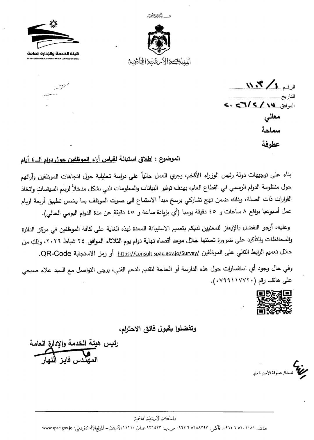 عاجل - الحكومة الأردنية تطرح استبيان مقترح تطبيق نظام الدوام الرسمي 4 أيام عمل