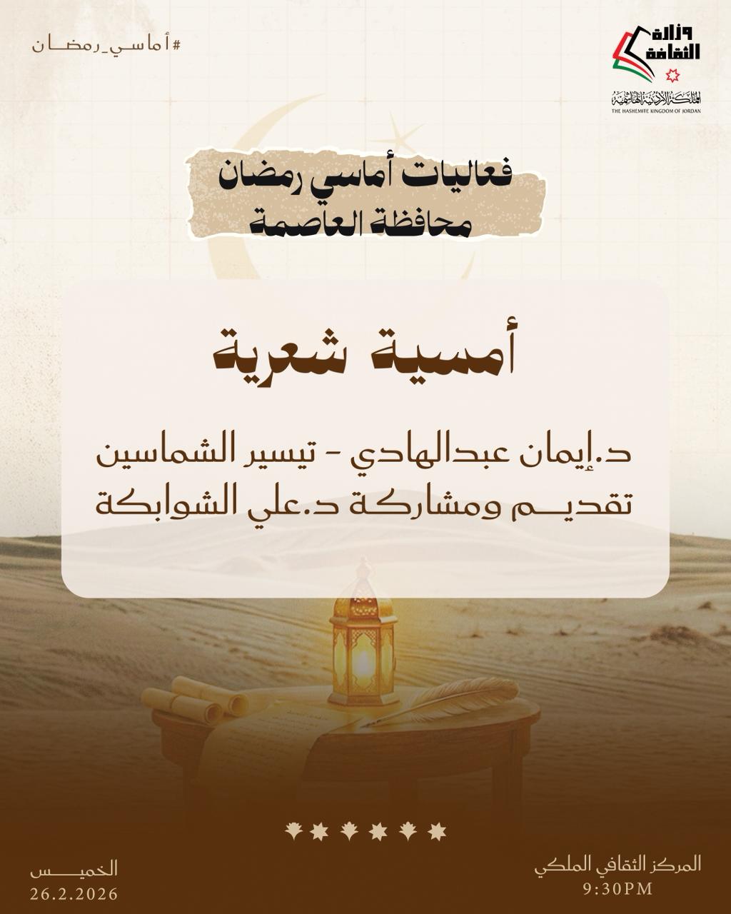 ففي محافظة العاصمة، يحتضن المركز الثقافي الملكي عند الساعة التاسعة والنصف مساء أمسية شعرية بمشاركة الدكتورة إيمان عبد الهادي وتيسير الشماسين، ويقدمها ويشارك فيها الدكتور علي الشوابكة.