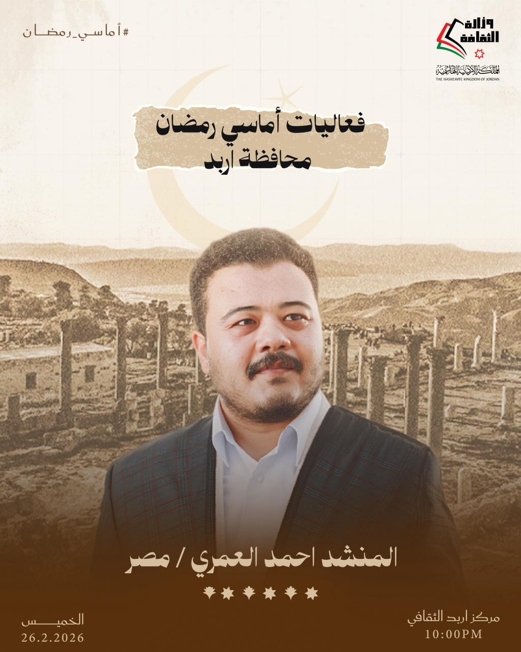 وفي محافظة إربد، فيحيي المنشد المصري أحمد العمري أمسية إنشادية عند العاشرة مساء على مسرح مركز إربد الثقافي.