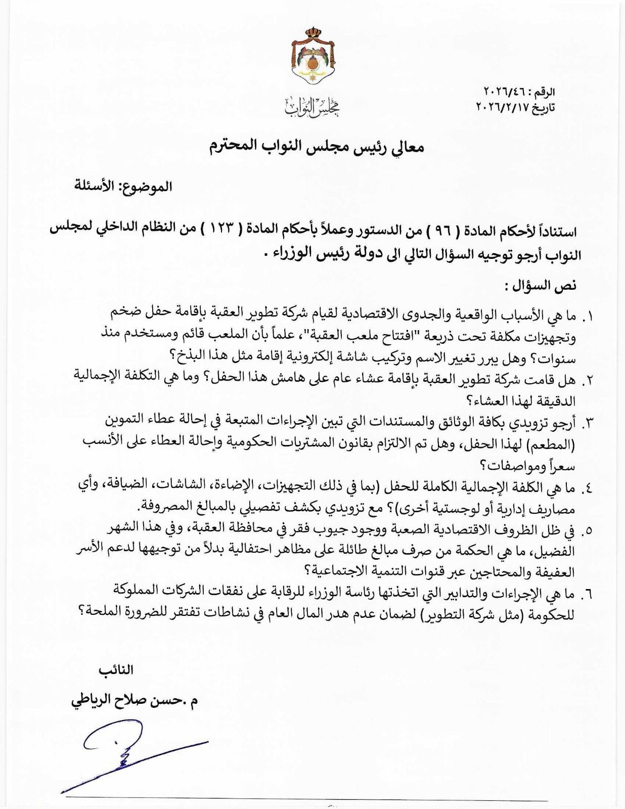 احمد قدورة - وجّه النائب حسن صلاح الرياطي، كتاباً رسمياً يحمل الرقم (46/2026) بتاريخ 17/2/2026 إلى معالي رئيس مجلس النواب الأردني، استناداً لأحكام المادة (96) من الدستور والمادة (123) من النظام الداخلي للمجلس، طالب فيه بتوجيه جملة من الأسئلة إلى دولة رئيس الوزراء حول ملابسات وكلفة حفل ما سُمّي بـ"افتتاح ملعب العقبة".