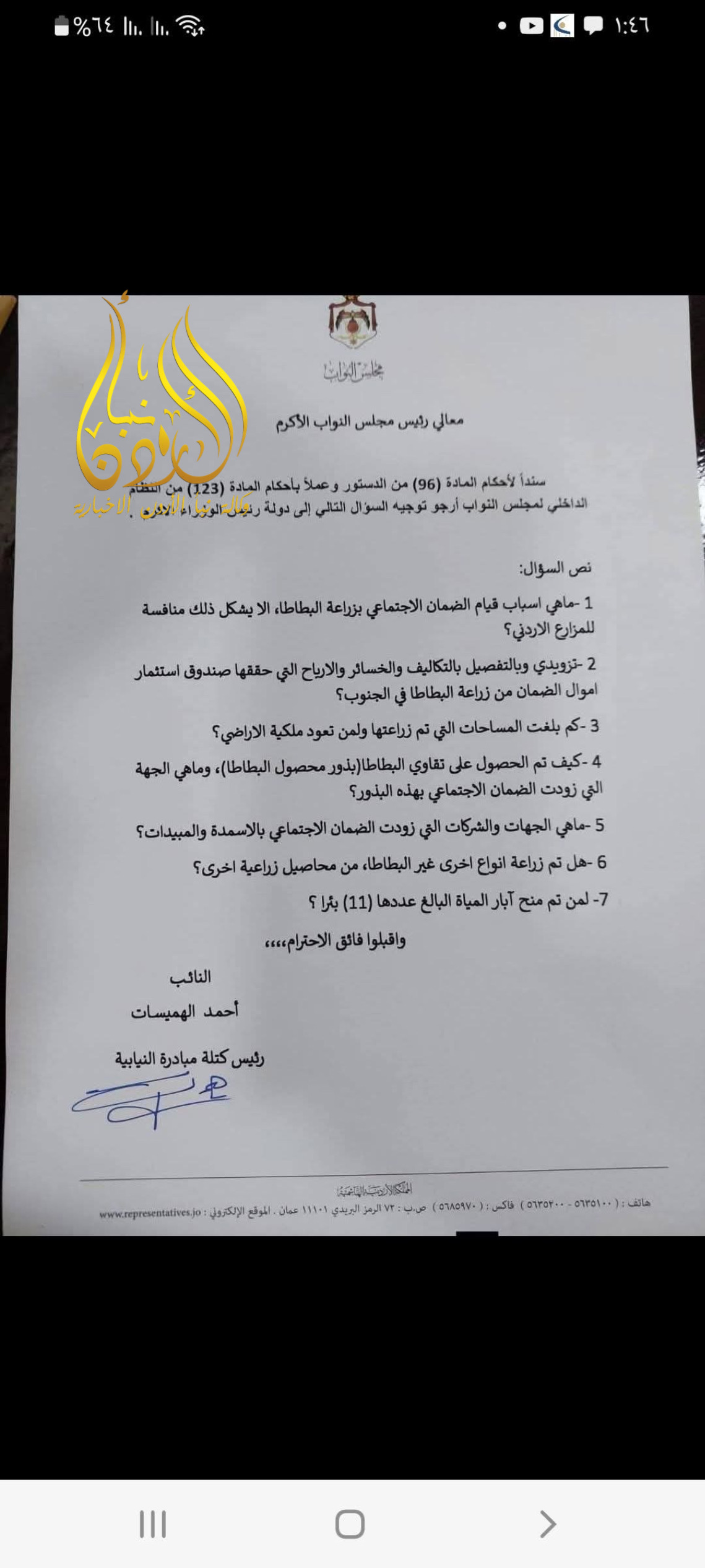 وجّه النائب أحمد الهميسات أسئلة إلى رئيس الوزراء جعفر حسان حول أسباب قيام مؤسسة الضمان الاجتماعي بزراعة البطاطا.
