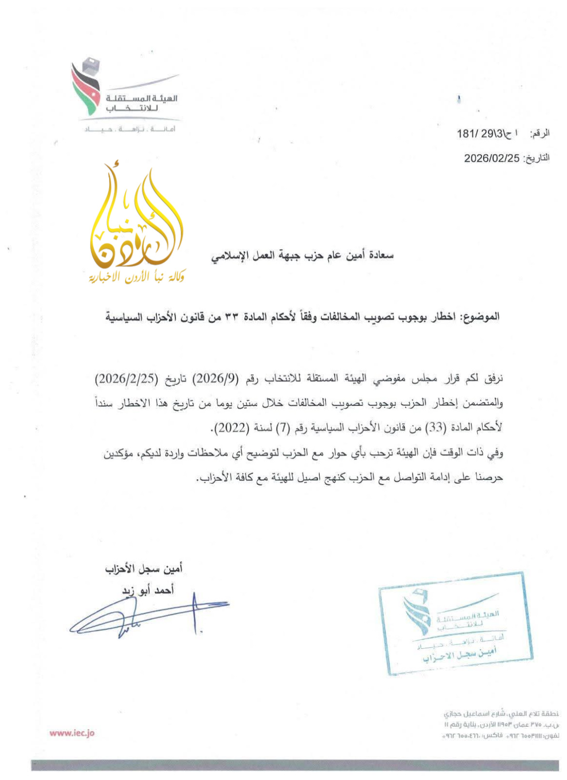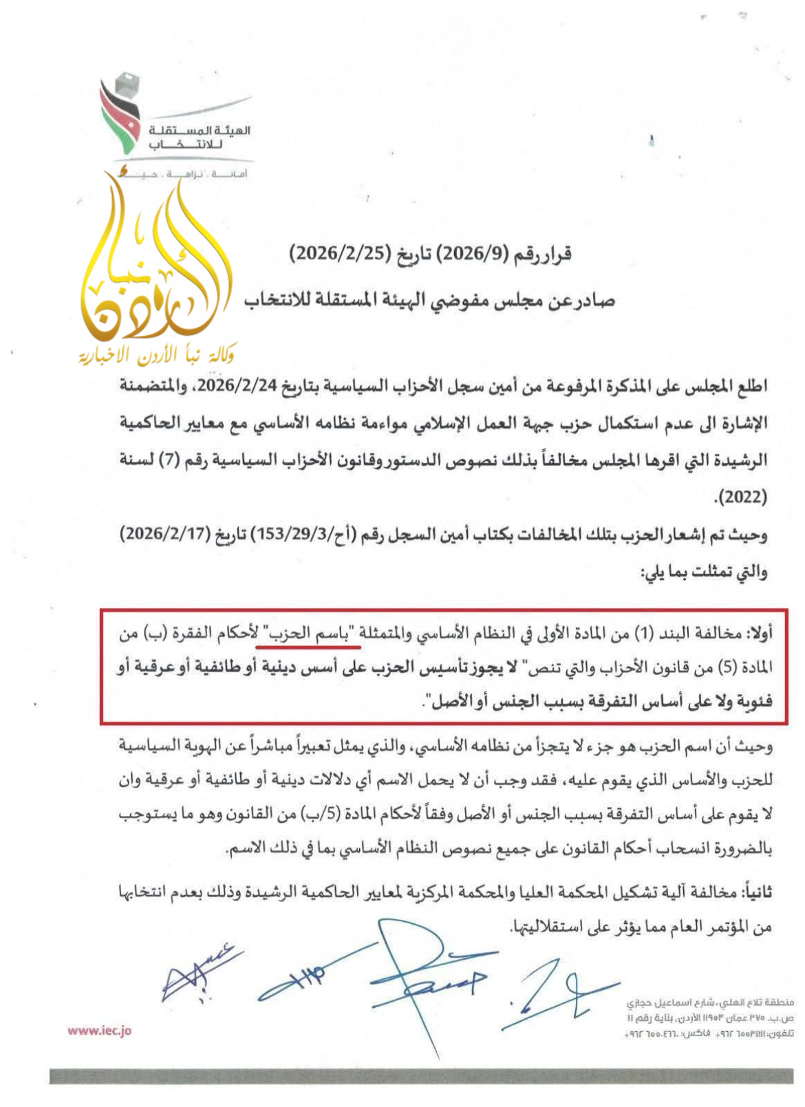 طلبت الهيئة المستقلة للانتخاب من حزب جبهة العمل الإسلامي تعديل اسمه الوارد في المادة (1) من نظامه الأساسي، وفق كتاب رسمي وجّهته إلى الحزب. وبحسب الوثائق، أوضحت الهيئة في مخاطبتها الصادرة بتاريخ 17 شباط 2026 أن البند (1) من المادة الأولى في النظام الأساسي للحزب يخالف أحكام الفقرة (ب) من المادة (5) من قانون الأحزاب، التي تنص على عدم جواز تأسيس الحزب على أسس دينية أو طائفية أو عرقية أو فئوية، أو على أساس التفرقة بسبب الجنس أو الأصل