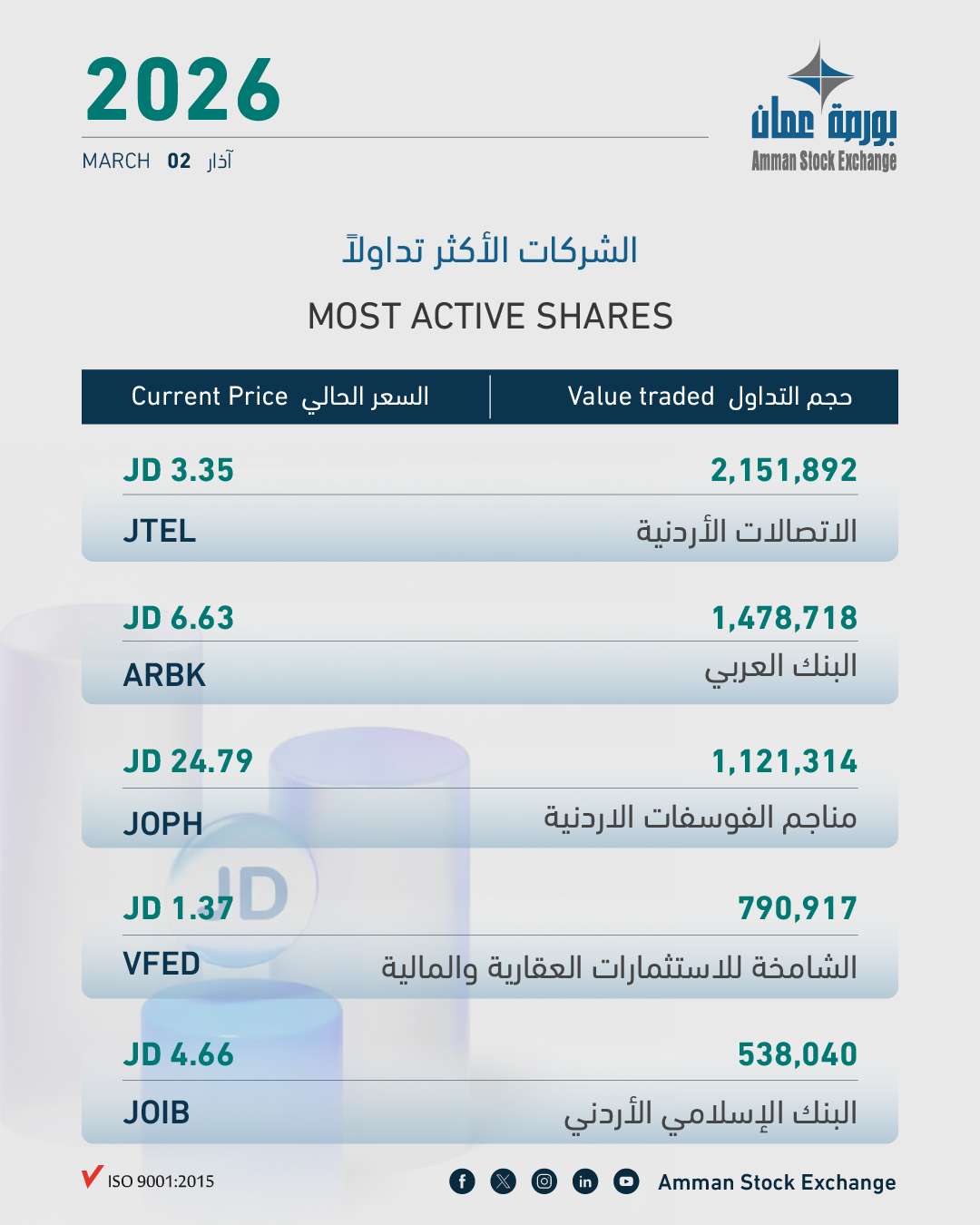 بلغ حجم التداول الإجمالي ليوم الاثنين 02/03/2026 حوالي (8.2) مليون دينار وعدد الأسهم المتداولة (3.2) مليون سهم، نفذت من خلال (2,468) عقداً.