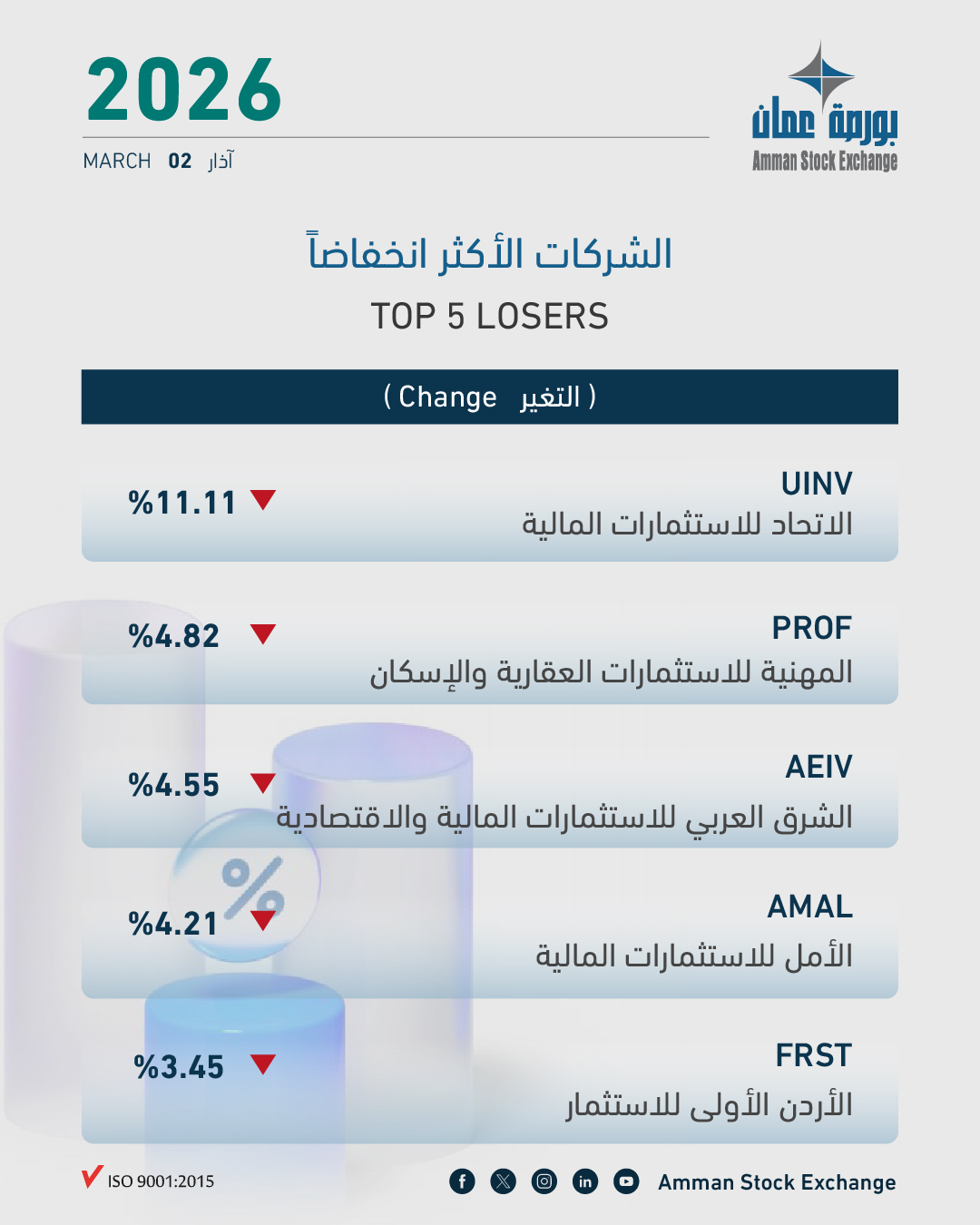 أما الشركات الخمس الأكثر انخفاضاً في أسعار أسهمها فهي الاتحاد للاستثمارات المالية بنسبة (11.11%), المهنية للاستثمارات العقارية والإسكان بنسبة (4.82%), الشرق العربي