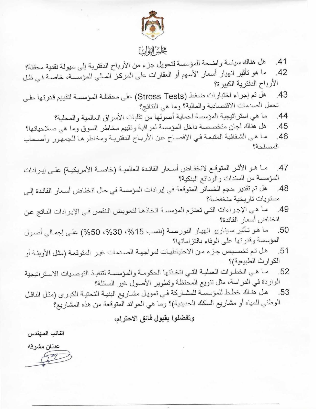 كما تساءل مشوقة عن المبررات الدستورية لرفع سن التقاعد أو تعديل آلية احتساب المنافع بحق مشتركين التحقوا بالنظام وفق شروط سابقة، في ضوء مبدأي الأمن القانوني والثقة المشروعة، إضافة إلى أسباب عدم فتح تحقيق أو تشكيل لجنة وطنية مستقلة لمراجعة قرارات الاستثمار والحوكمة داخل المؤسسة قبل تحميل المشتركين أعباء إضافية.