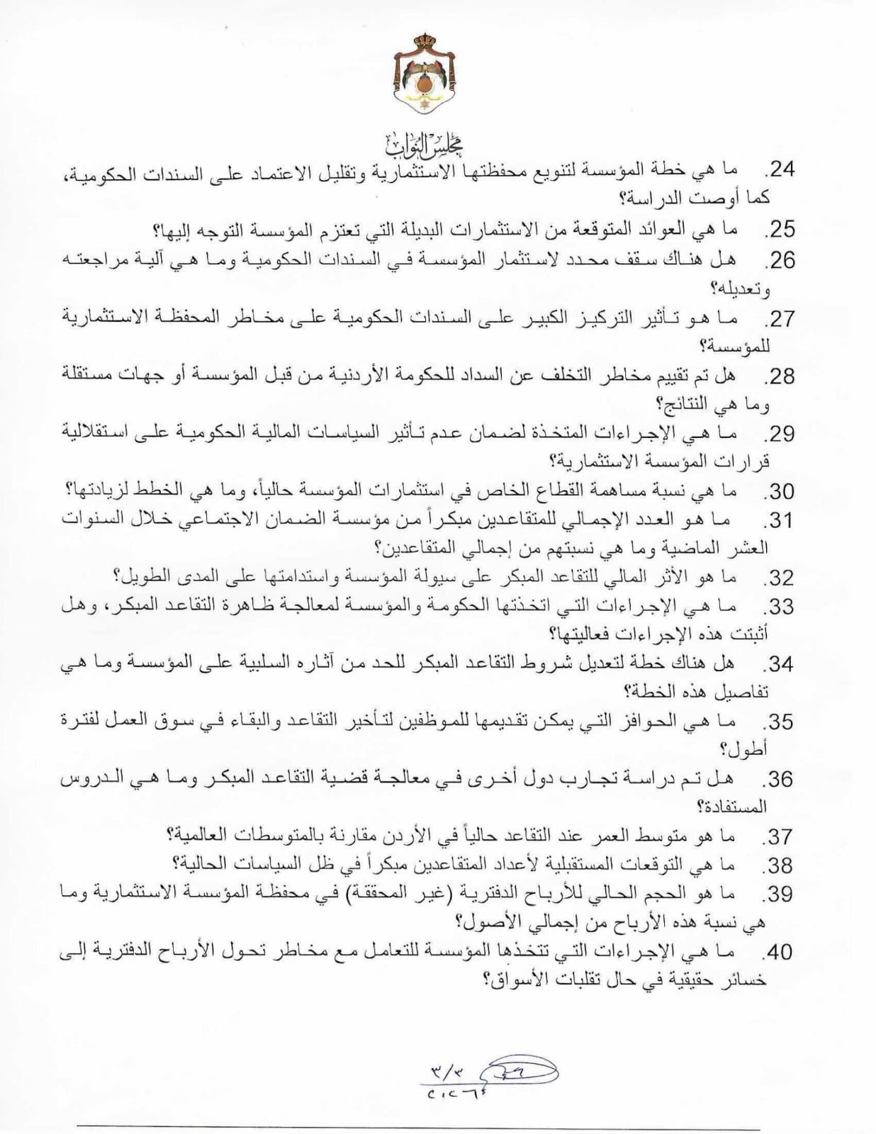 وشملت الأسئلة محاور متعددة، في مقدمتها أسباب تكرار التعديلات الجوهرية على قانون الضمان منذ عام 2001، ومدى نشر الدراسة الاكتوارية الكاملة باللغة العربية، وما إذا كانت تتضمن بدائل متعددة وتحليلاً لأثر كل بديل على الفئات العمرية المختلفة، خاصة من تجاوزوا نصف مدة اشتراكهم.