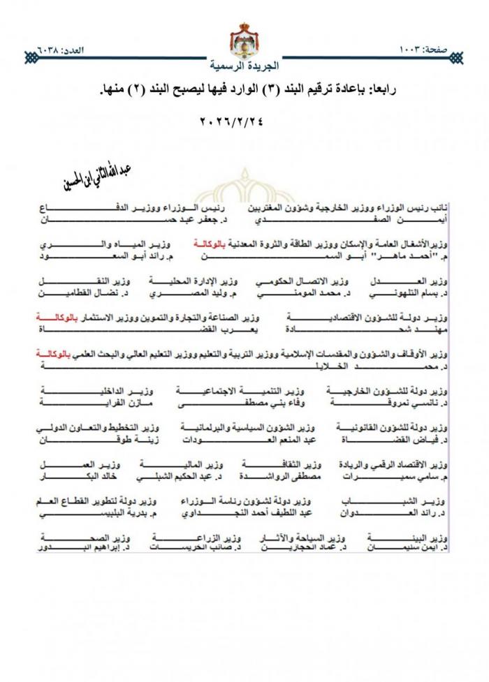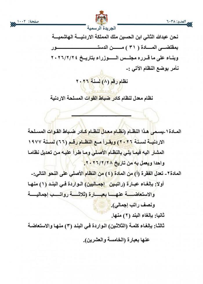 صدرت الإرادة الملكية وبناء على ما قرره مجلس الوزراء بوضع نظام معدل لنظام كادر ضباط القوات المسلحة الأردنية.