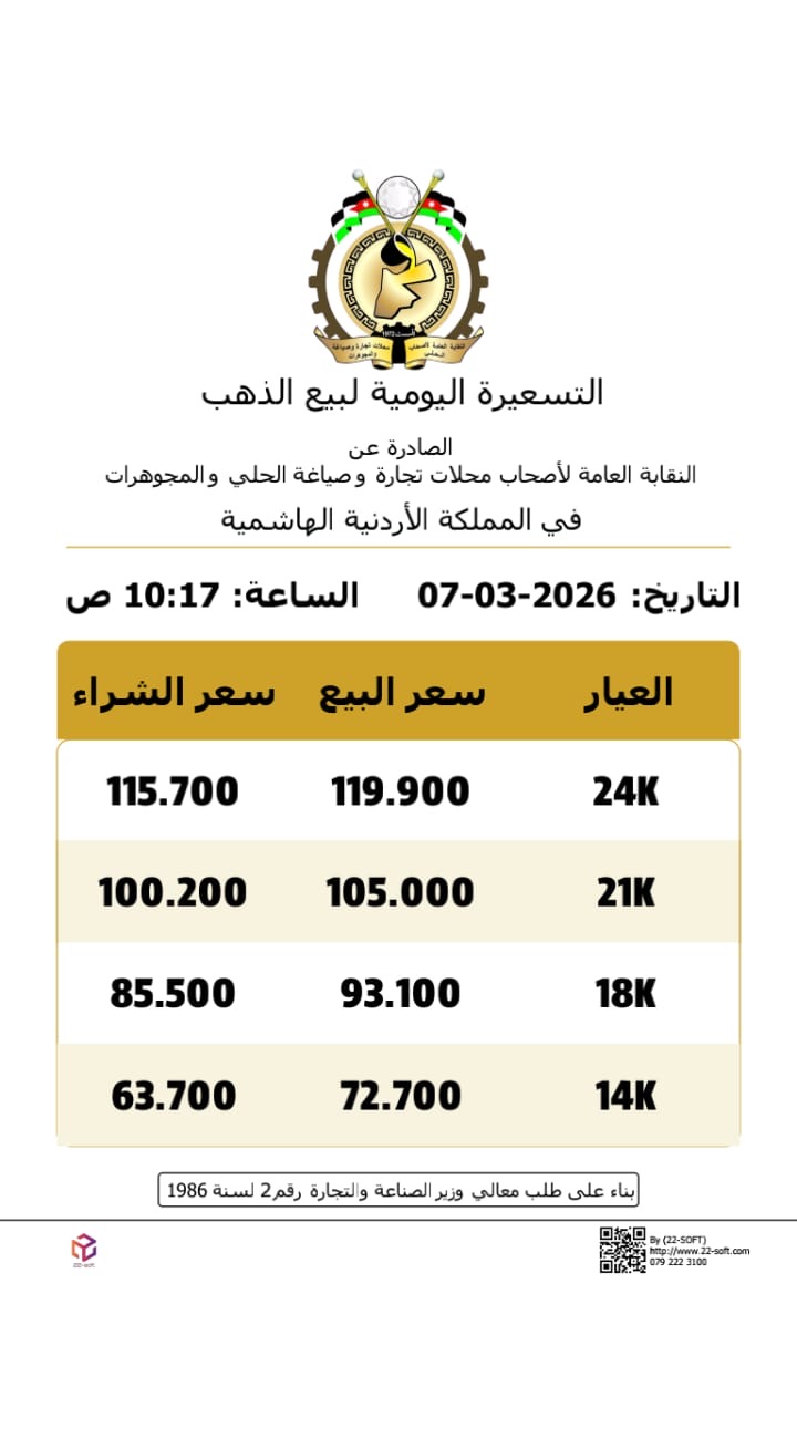 وحسب رئيس النقابة العامة لأصحاب محلات تجارة وصياغة الحلي والمجوهرات ربحي علان، بلغ سعر الليرة الرشادي وزن 7 غرامات 730 دينارا، والليرة الإنجليزي وزن 8 غرامات 835 دينارا.