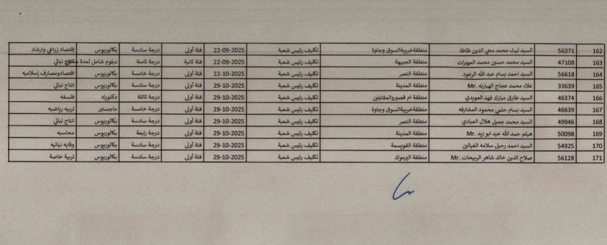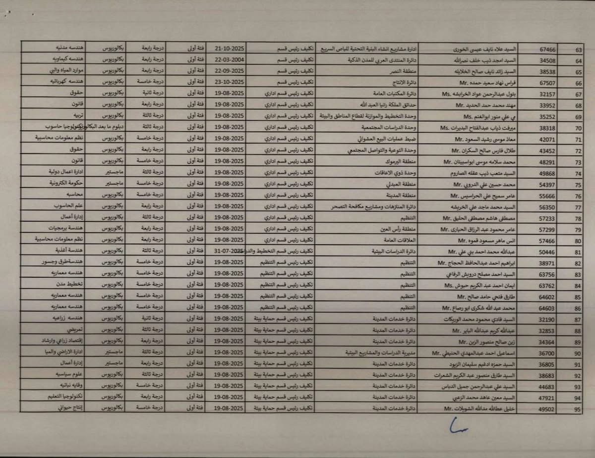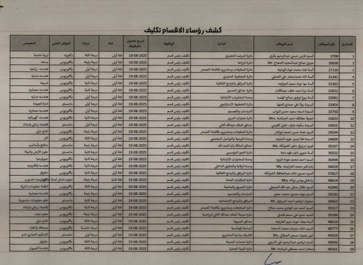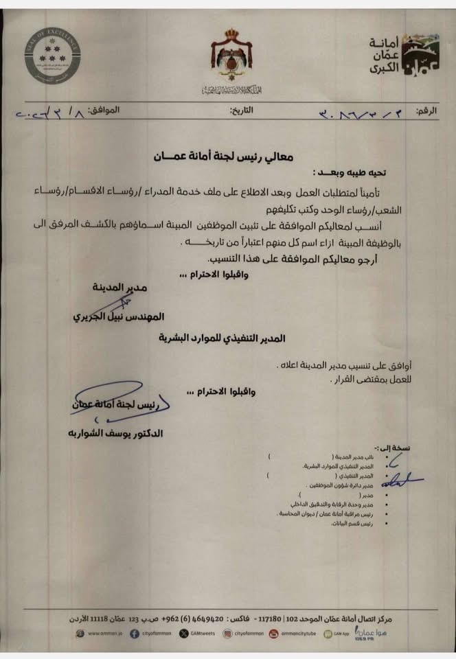 رفعت الإدارة التنفيذية للموارد البشرية في أمانة عمّان تنسيباً إلى رئيس لجنة الأمانة للموافقة على تثبيت الموظفين المبينة أسماؤهم في الكشف المرفق بالوظيفة المبينة إزاء اسم كل منهم، وذلك تأميناً لمتطلبات العمل وبعد الاطلاع على ملفات خدمة المدراء ورؤساء الأقسام والشعب والوحدات وكتب تكليفهم، اعتباراً من تاريخه