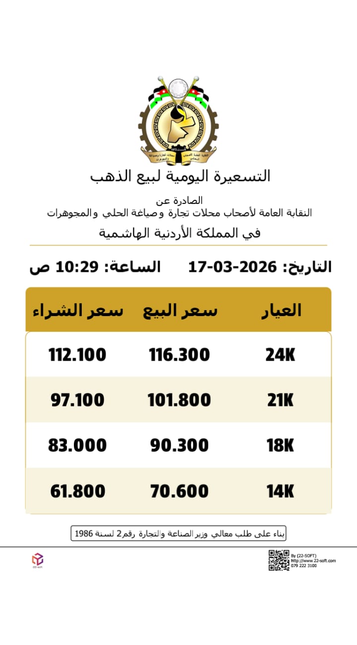 وبحسب التسعيرة، بلغ سعر بيع غرام الذهب عيار 24 نحو 116.3 دينار، مقابل 112.1 دينار لغايات الشراء، فيما سجل عيار 21 الأكثر طلبًا في السوق المحلية 101.8 دينار للبيع و97.1 دينار للشراء.