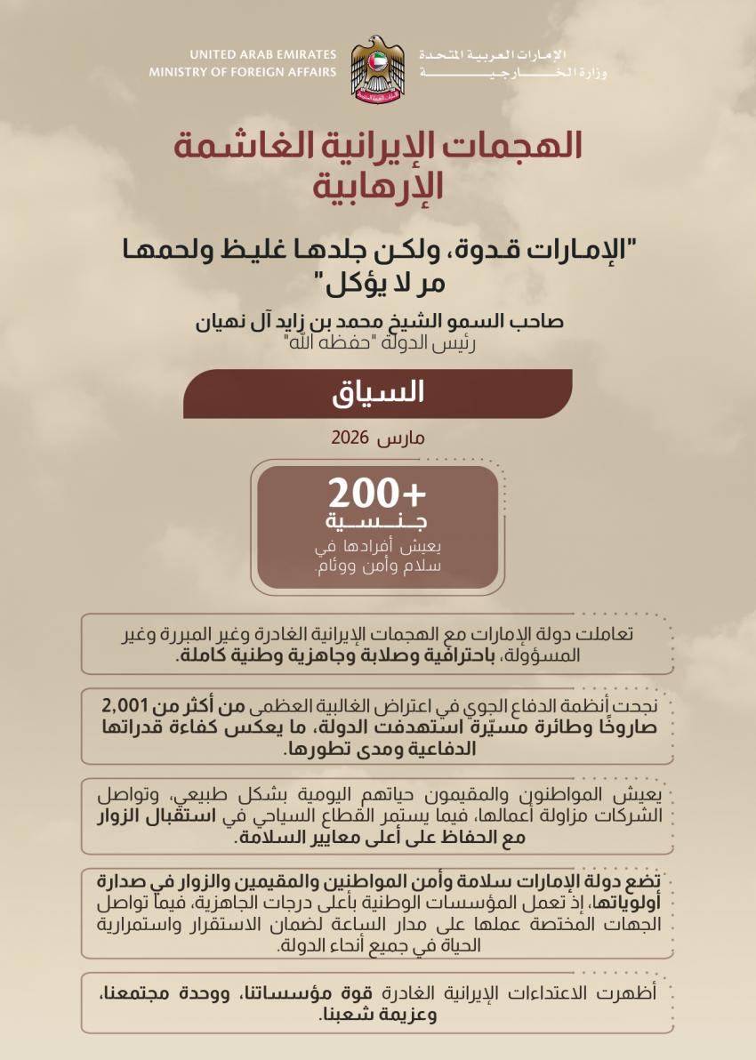 أكدت دولة الإمارات العربية المتحدة، قدرتها الفائقة على صون أمنها واستقرارها في وجه "الهجمات الإيرانية الغاشمة"، مجسدةً مقولة رئيس الدولة الشيخ محمد بن زايد آل نهيان: "الإمارات قدوة، ولكن جلدها غليظ ولحمها مر لا يؤكل".