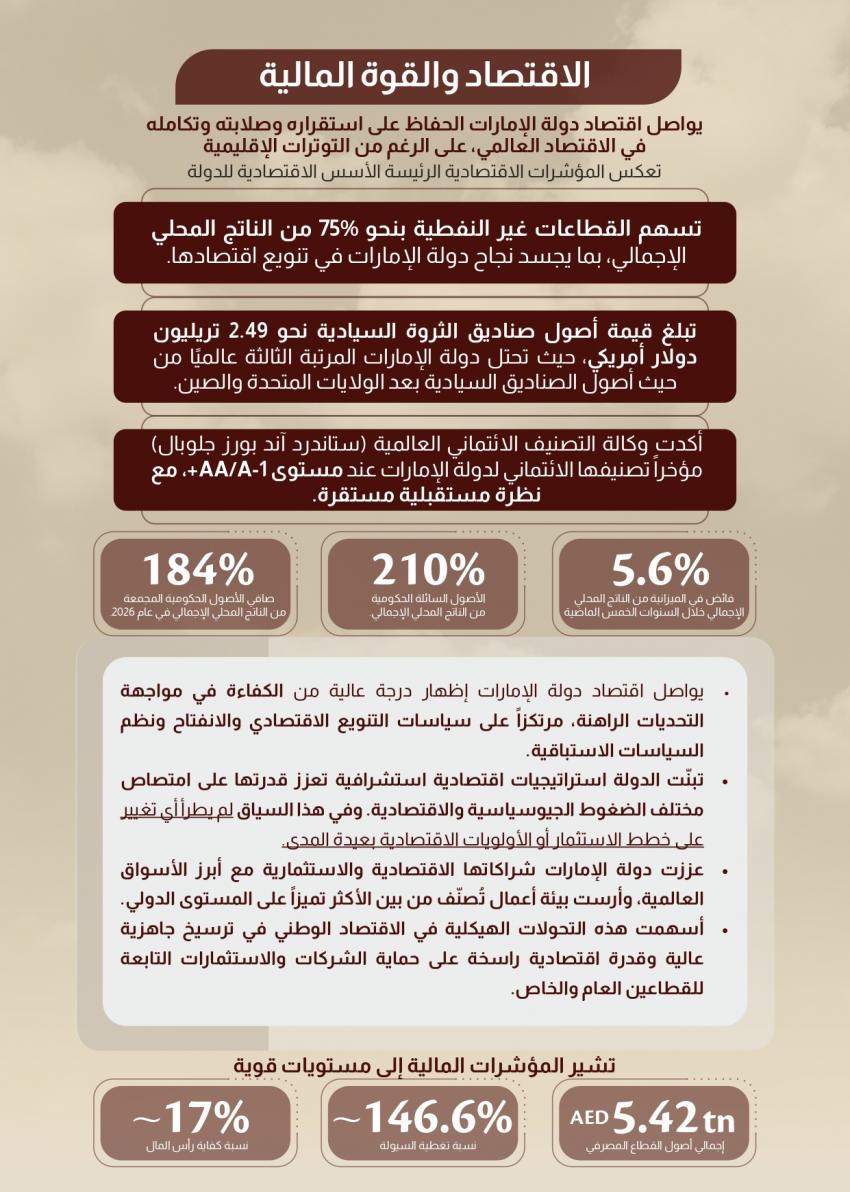 تثبت هذه المعطيات أن دولة الإمارات، التي تضم أكثر من 200 جنسية تعيش في وئام، تمتلك الجاهزية الوطنية والعمق الاستراتيجي لامتصاص الضغوط ومواصلة مسيرة التنمية دون تغيير في خططها الاستثمارية طويلة المدى.