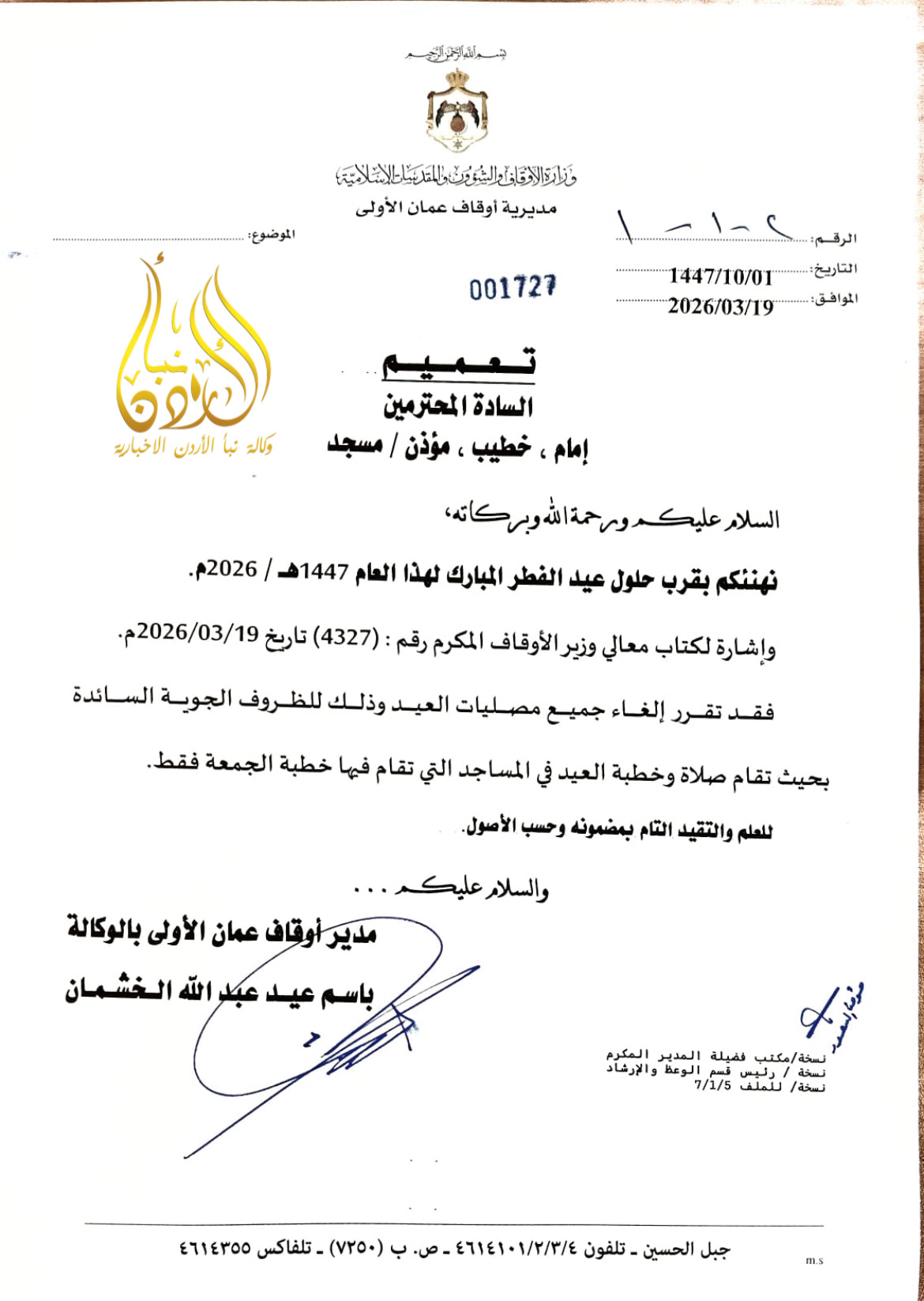 عاجل - إلغاء مصليات العيد بسبب الأحوال الجوية (وثيقة)