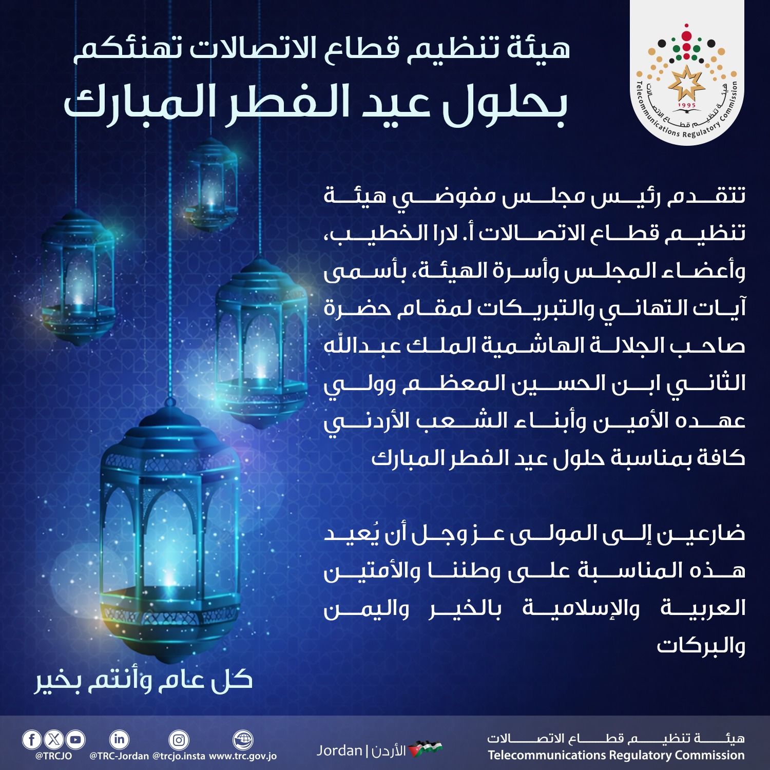 وبالنيابة عن كافة العاملين في المجموعة من مقام حضرة صاحب الجلالة الهاشمية الملك عبد الله الثاني ابن الحسين المعظم وولي عهده الأمين الأمير الحسين بن عبدالله الثاني بأصدق التهاني والتبريكات بمناسبة حلول عيد الفطر السعيد.