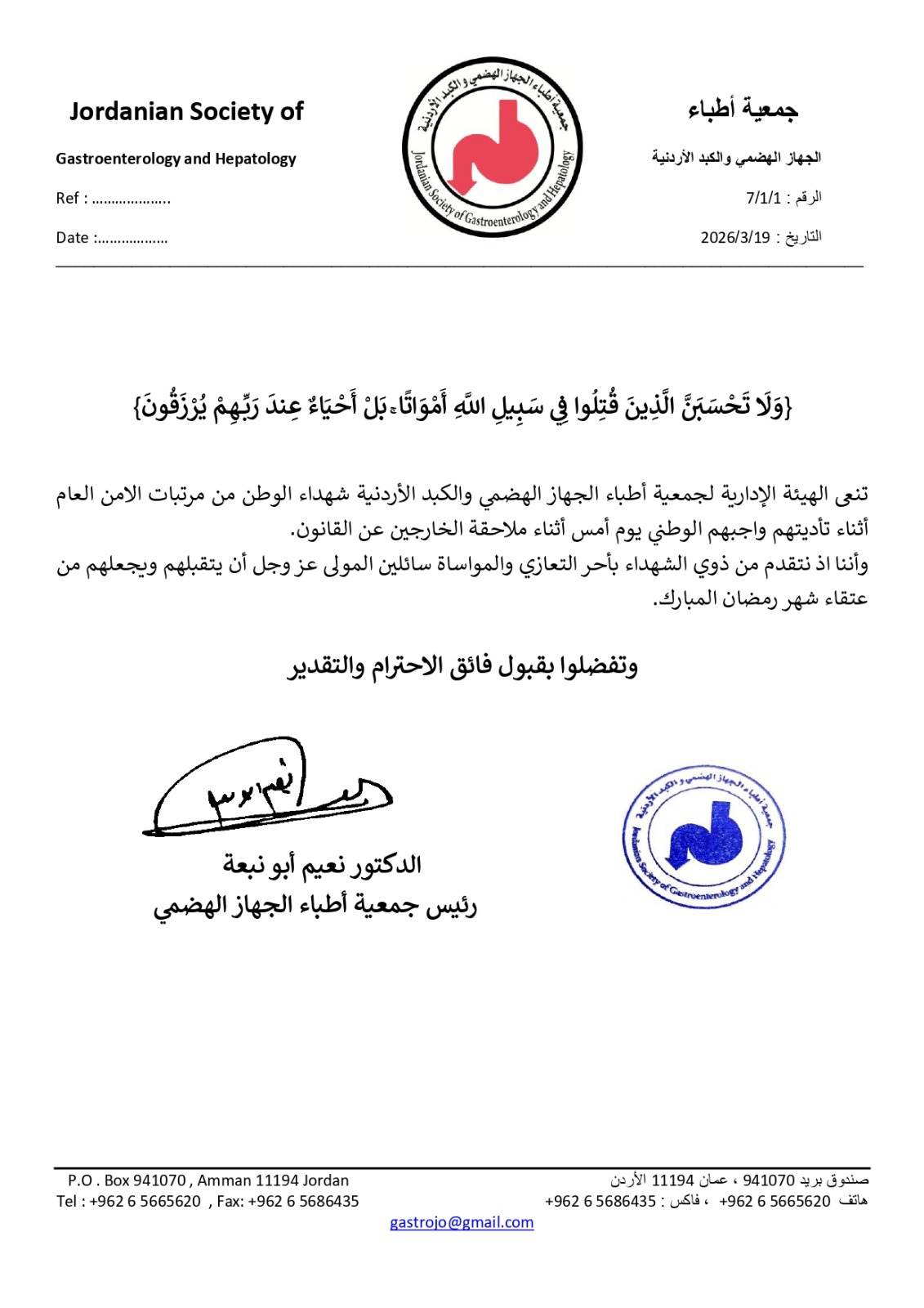 نعت جمعية أطباء الجهاز الهضمي والكبد الأردنية شهداء الوطن من مرتبات مديرية الأمن العام، الذين استشهدوا أثناء تأديتهم واجبهم الوطني خلال ملاحقة خارجين عن القانون. مؤكدة أن الشهداء ارتقوا وهم يؤدون واجبهم في حماية أمن الوطن واستقراره، ما يجسد أسمى معاني التضحية والفداء.