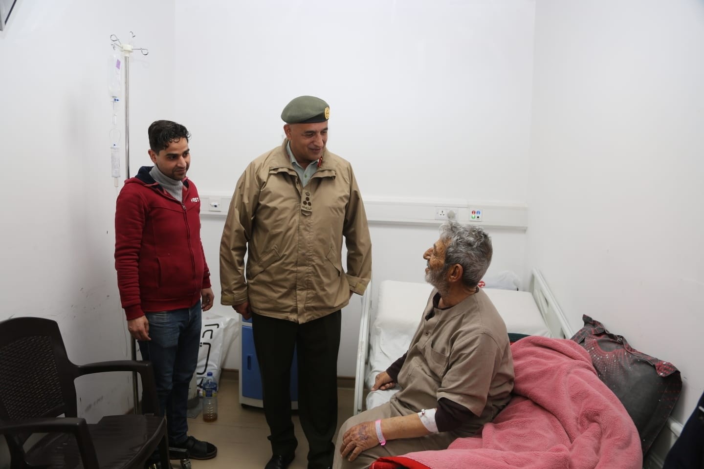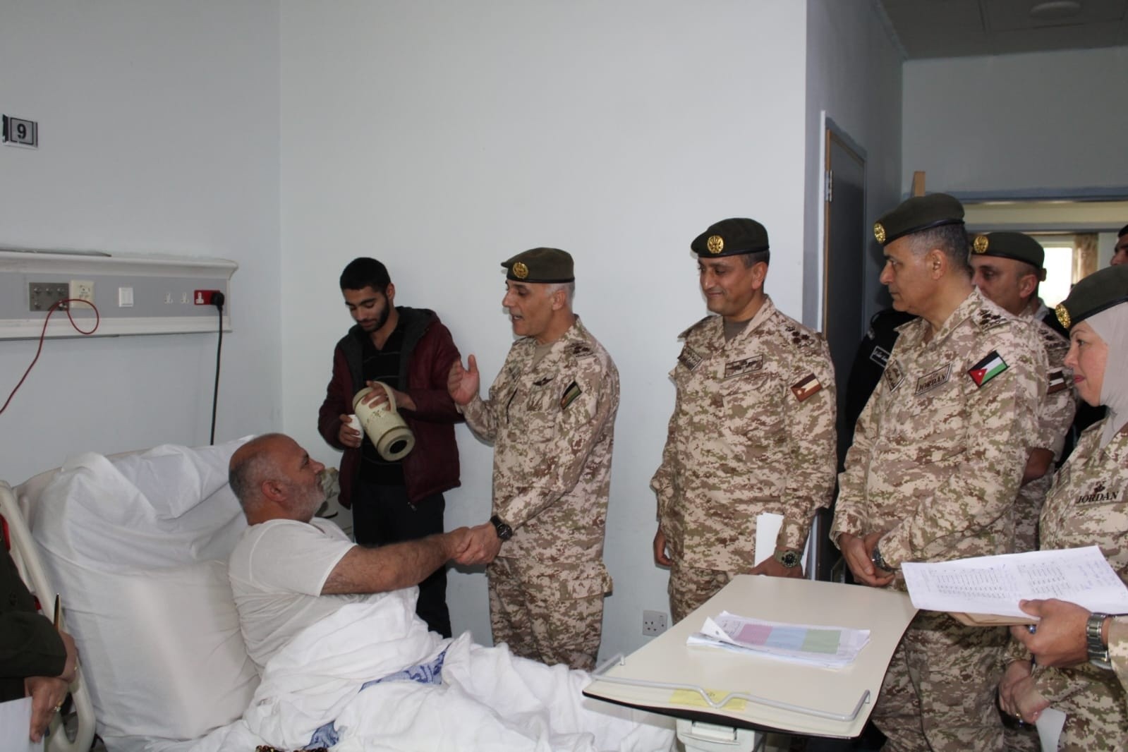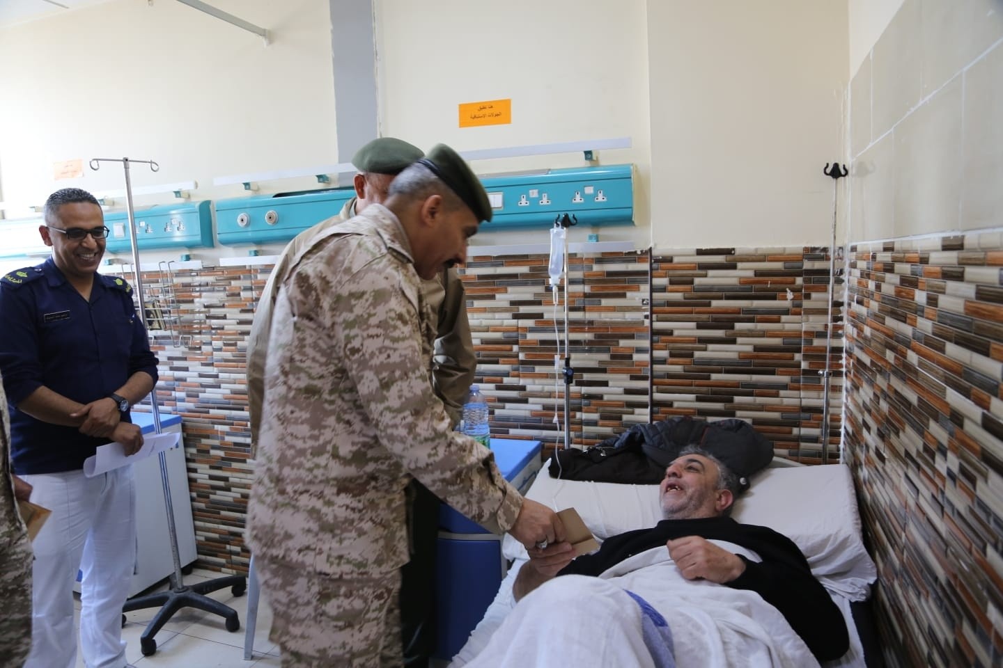 كما عاد عدد من كبار ضباط القوات المسلحة المرضى من المتقاعدين والعاملين، اللذين يرقدون على أسرة الشفاء في المستشفيات العسكرية التابعة لمديرية الخدمات الطبية الملكية بمختلف محافظات المملكة، للاطمئنان على صحتهم ومستوى الخدمات الصحية المقدمة لهم، ونقلوا لهم تهنئة القيادة العامة للقوات المسلحة بمناسبة عيد الفطر السعيد، وتمنياتها لهم بالشفاء العاجل.