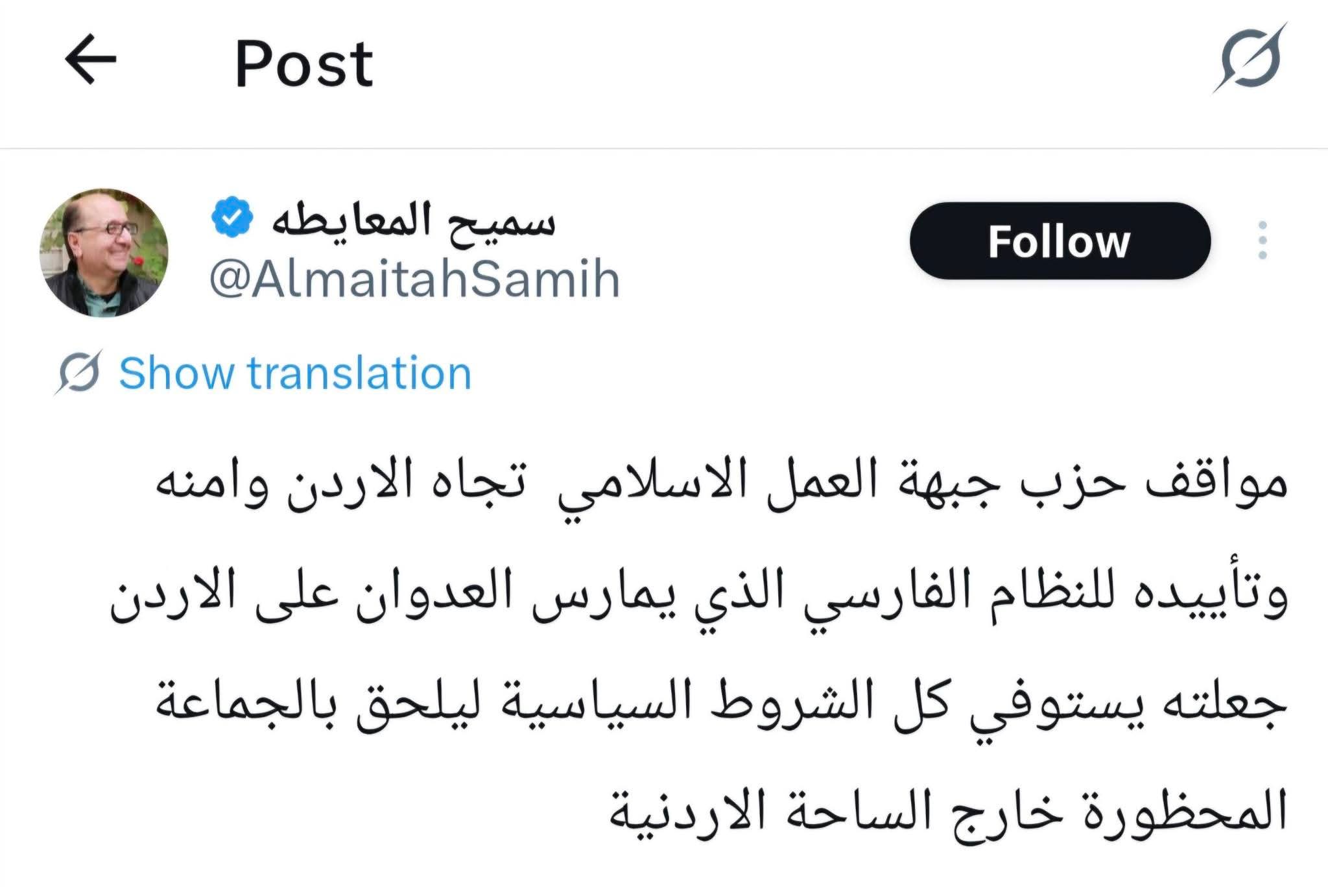 وجاءت هذه الدعوة على خلفية تغريدة للمعايطة قال فيها بأن حزب جبهة العمل الإسلامي قد استوفى شروط حظره كما حدث مع جماعة الإخوان المسلمين، وذلك بسبب تأييده للنظام الفارسي الذي يعتدي على الأردن.