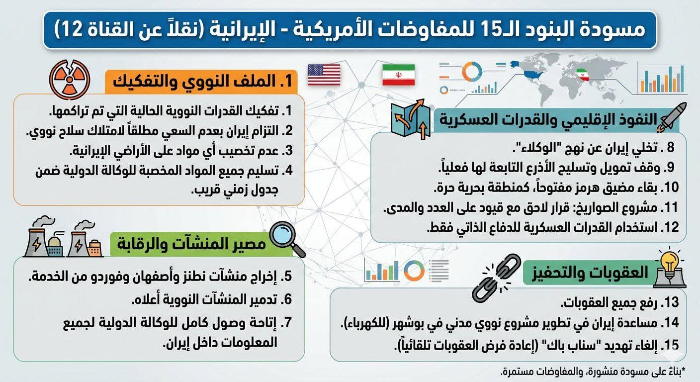 كشفت "القناة 12" الإسرائيلية، الثلاثاء، عن تحرّك أميركي لإعداد وثيقة من 15 بنداً تهدف إلى إنهاء الحرب مع إيران، تتضمن وقفاً لإطلاق النار لمدة شهر، يجري خلاله التفاوض على اتفاق إطار يشبه التفاهمات السابقة في غزة ولبنان.