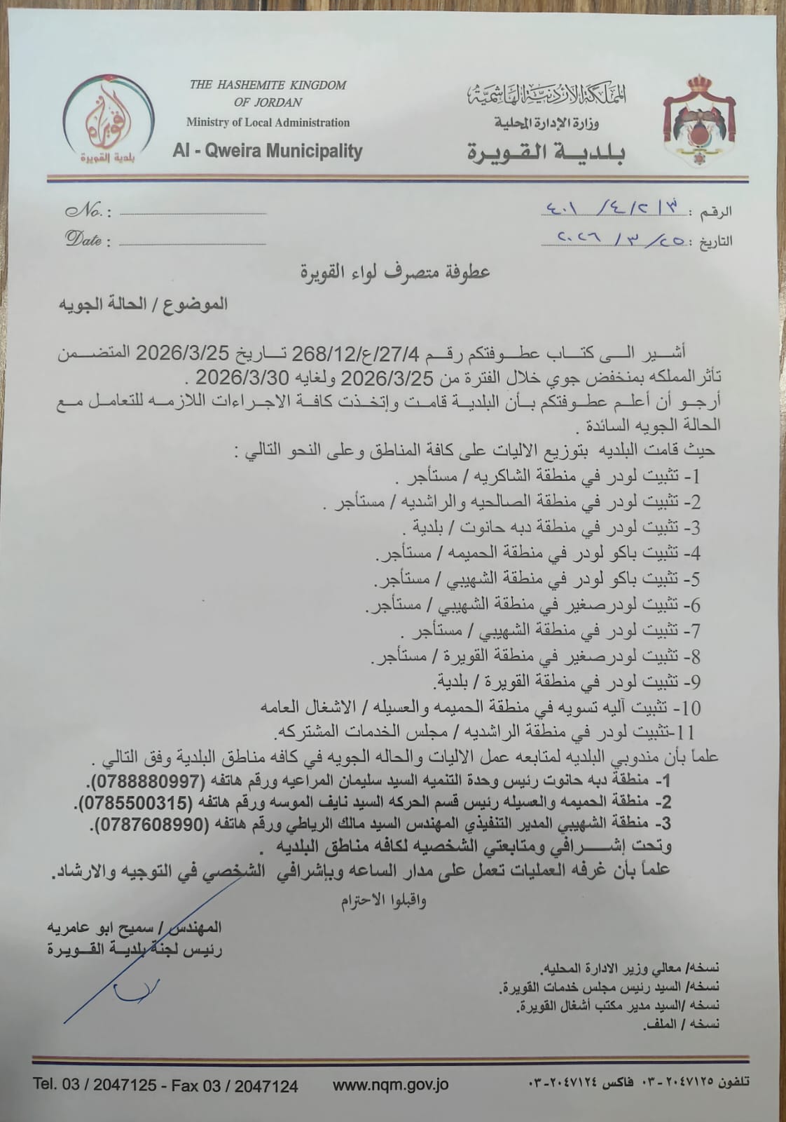 ابو عامرية : بلدية القويره جاهزة للتعامل مع المنخفض الجوي ...وثيقه