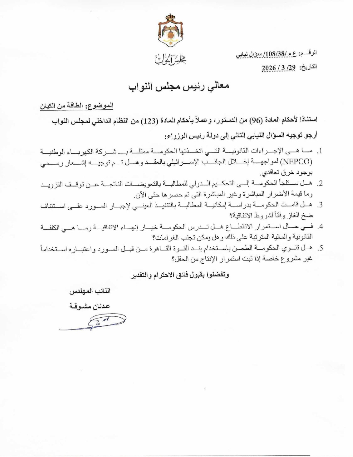مشوقة يوجه سؤالاً نيابياً إلى الحكومة حول الإجراءات القانونية المتعلقة بملف الطاقة
