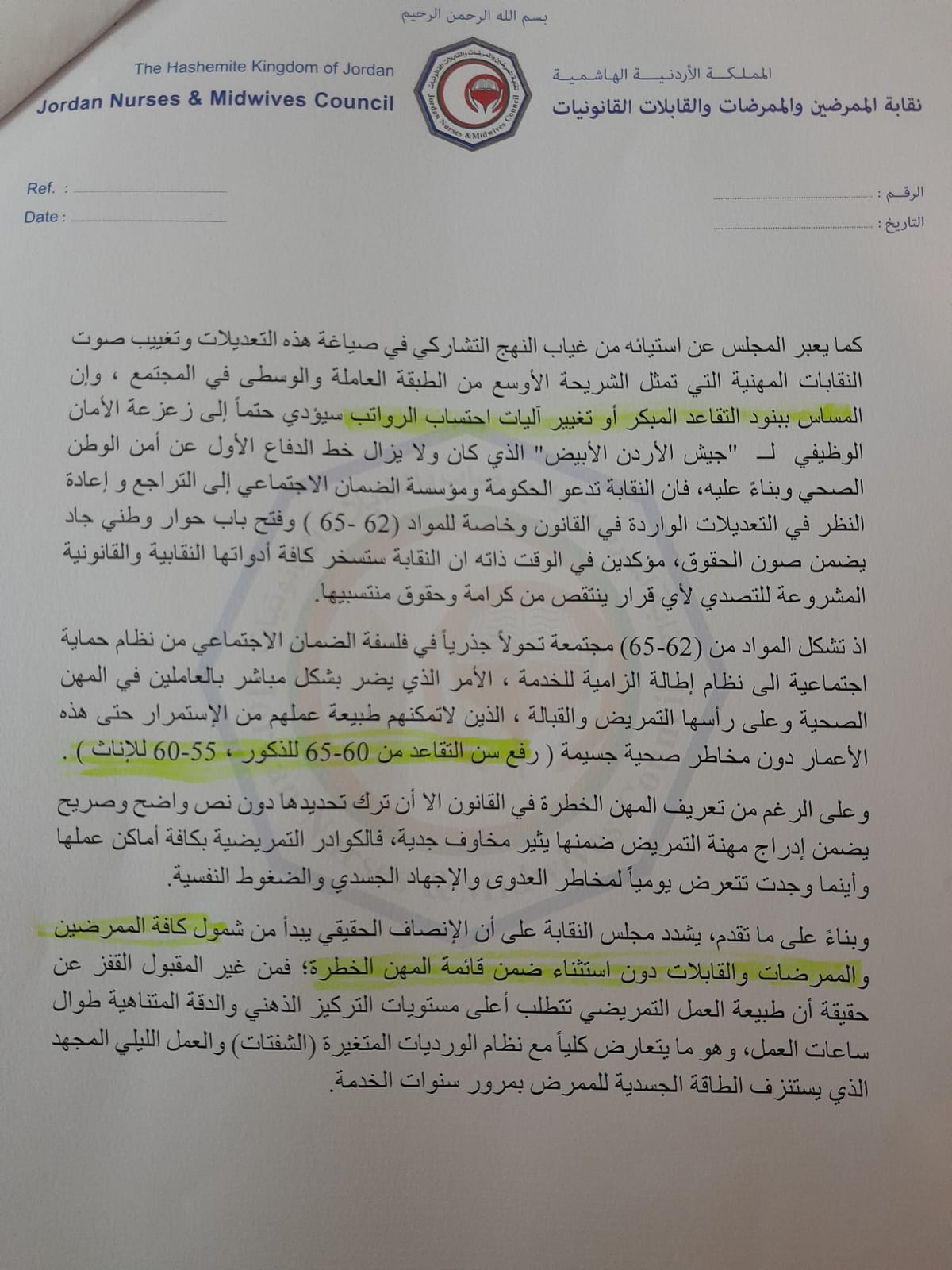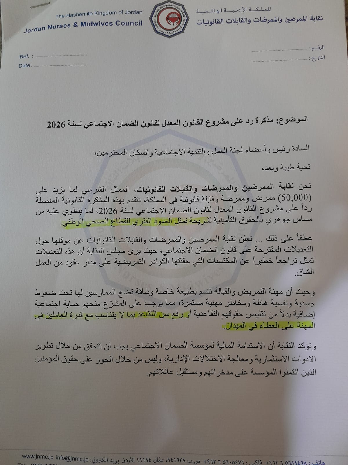 وطالب الروابدة بضرورة إعادة النظر في عدد من مواد القانون، بما يضمن تمثيلاً عادلاً للنقابات المهنية في مؤسسة الضمان، ومعالجة الاختلالات المالية دون تحميل المشتركين أعباء إضافية، إلى جانب شمول مهنة التمريض ضمن المهن الخطرة، نظراً لما يتعرض له العاملون فيها من مخاطر العدوى والإجهاد الجسدي والنفسي.