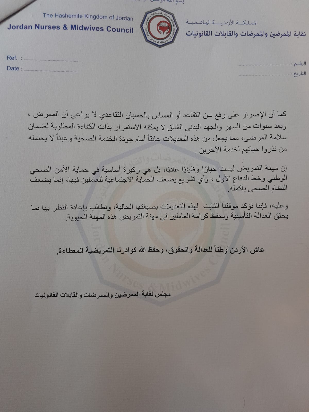 وأشار إلى أن التعديلات المقترحة تمثل تراجعاً عن المكتسبات التي حققتها الكوادر التمريضية، داعياً إلى إعادة النظر فيها بما يحقق العدالة ويحفظ كرامة العاملين في هذا القطاع الحيوي، مؤكداً أن مهنة التمريض تشكل ركيزة أساسية في حماية الأمن الصحي الوطني، وأن أي إضعاف للحماية الاجتماعية للعاملين فيها سينعكس سلباً على المنظومة الصحية بأكملها.