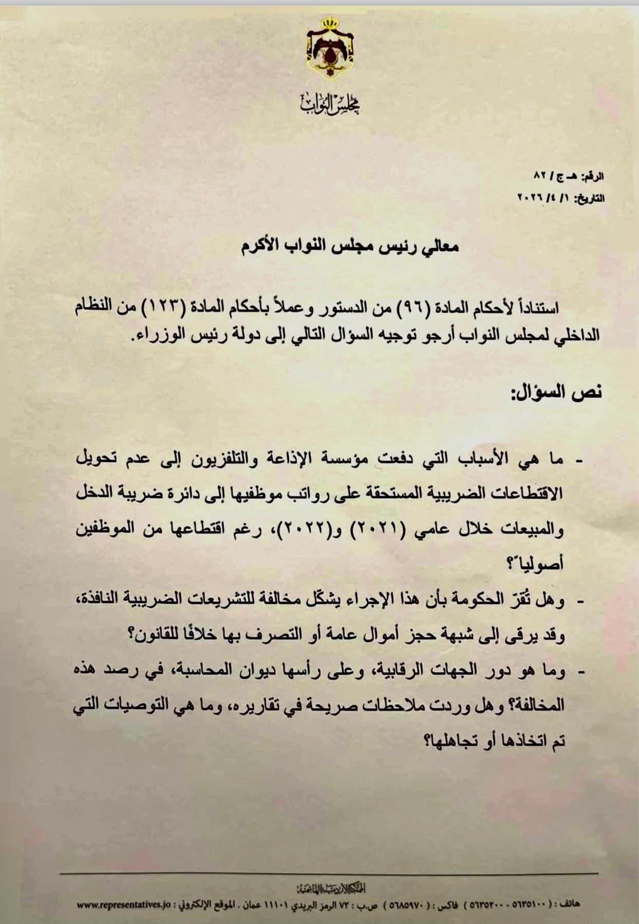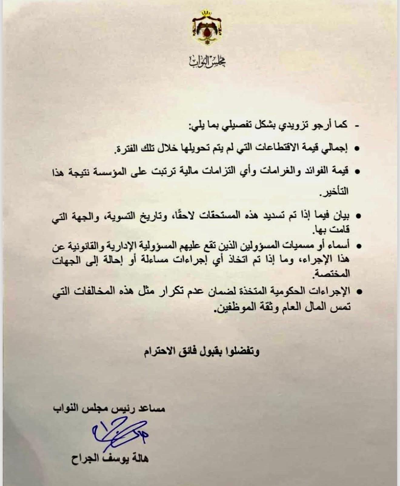 وتساءلت الجراح في كتابها الرسمي عن الأسباب التي دفعت المؤسسة لعدم تحويل هذه الاقتطاعات رغم حسمها من الرواتب، ومدى اعتراف الحكومة بأن هذا الإجراء يشكل مخالفة صريحة للتشريعات الضريبية النافذة.