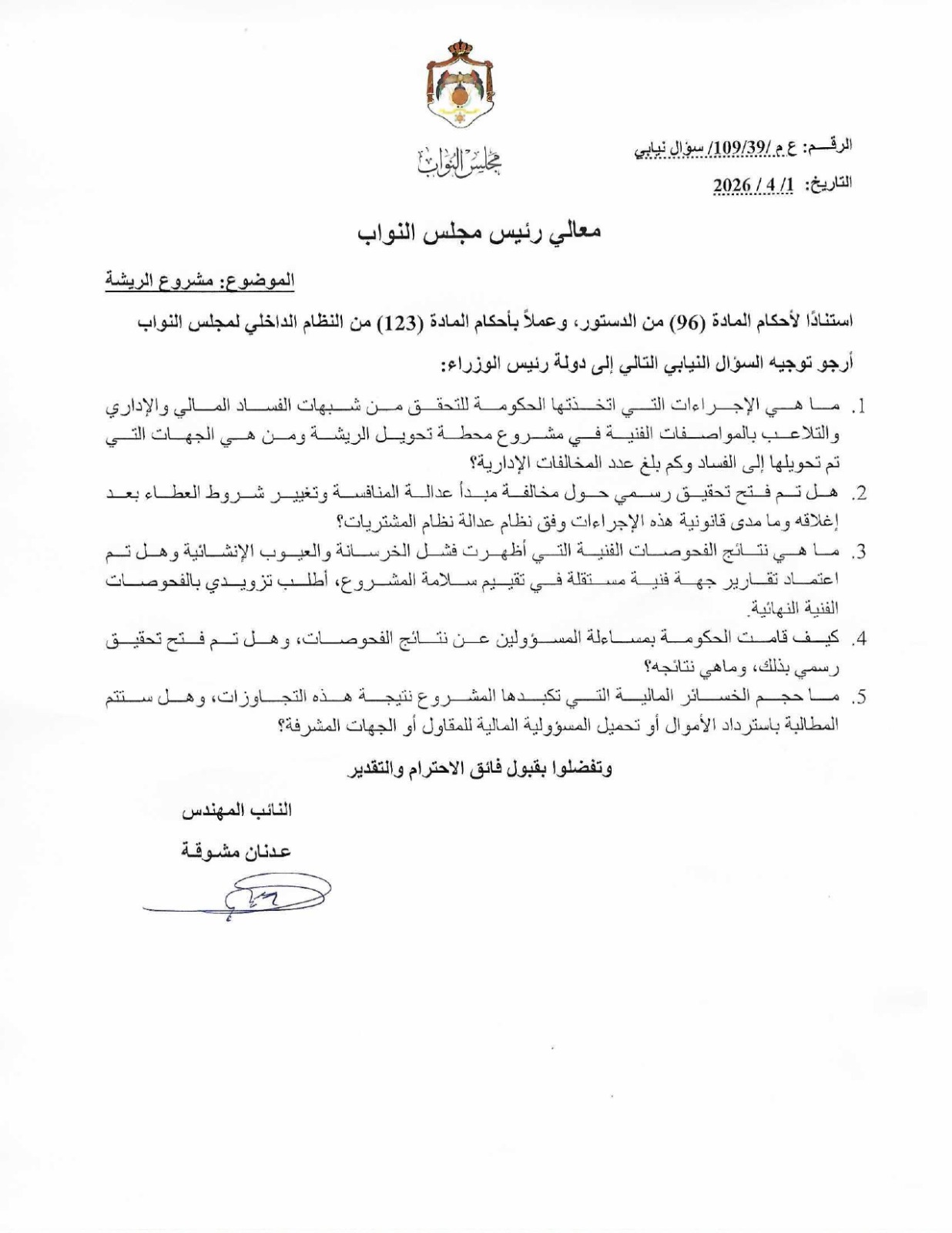 مشوقة يسأل الحكومة عن شبهات فساد وخلل فني في مشروع الريشة