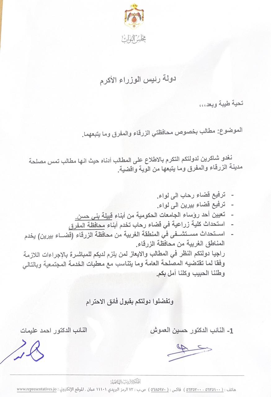 وفي سياق متصل، طالب النائبان، من خلال مذكرة خطية، بتعيين أحد أبناء قبيلة بني حسن رئيساً لإحدى الجامعات الحكومية، مؤكدين أهمية تمثيل الكفاءات الوطنية من مختلف المناطق.