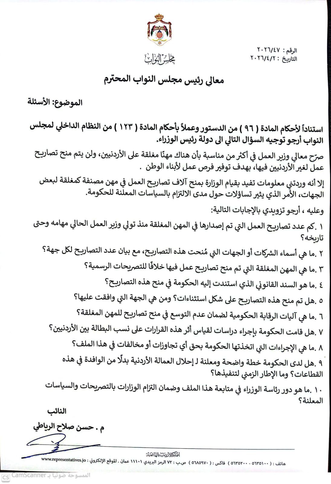 الرياطي يسأل رئيس الوزراء عن تصاريح “المهن المغلقة” .. وآلاف الاستثناءات المخالفة للتصريحات الرسمية