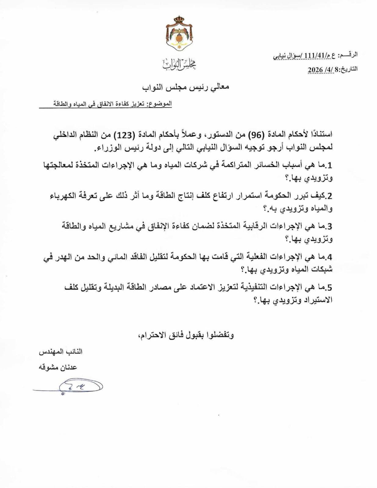 استنادًا لأحكام المادة (96) من الدستور، وعملاً بأحكام المادة (123) من النظام الداخلي لمجلس النواب أرجو توجيه السؤال النيابي التالي إلى دولة رئيس الوزراء.