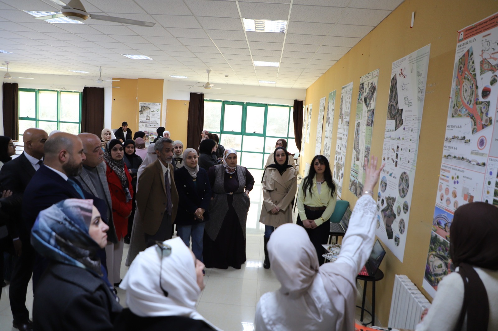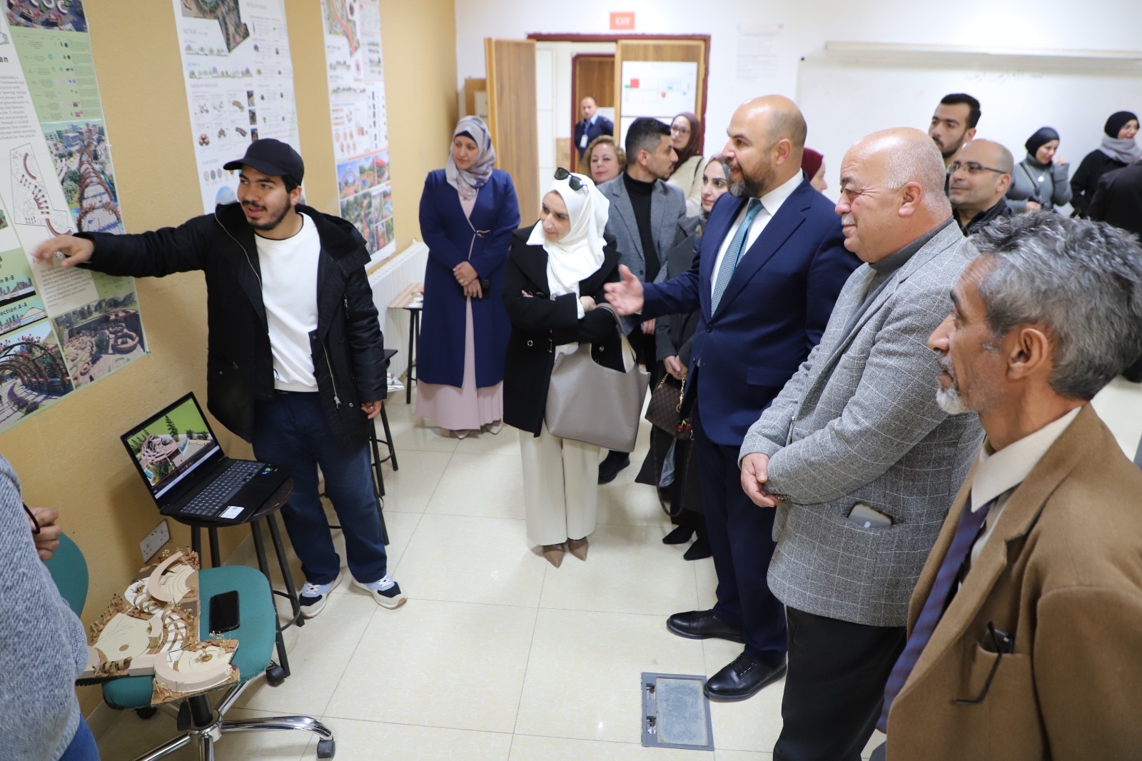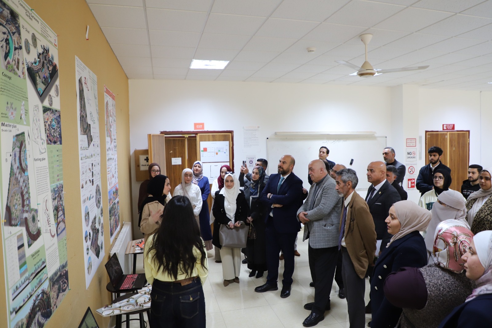واطّلع الوفد خلال الزيارة على مشاريع طلبة مساق هندسة تنسيق المواقع في قسم هندسة العمارة، حيث قدم الطلبة مجموعة من التصاميم والمقترحات التخطيطية لإنشاء حديقة داخل الحرم الجامعي، صُممت لتكون مساحة خضراء تفاعلية تخدم المجتمع المحلي وطلبة الجامعة، وتوفر مساحات متعددة الاستخدامات تجمع بين البعد الجمالي والوظيفي.