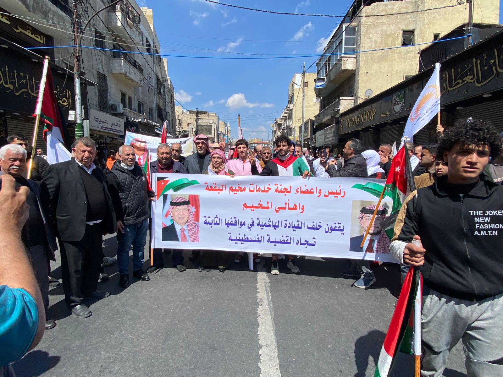 في مشهد مهيب يجسد عمق الانتماء الأردني الفلسطيني وتلاحم الجذور والدم والمصير خرج آلاف اللاجئين من مخيمات البقعة والحسين والوحدات وسخنة وإربد وسارت بهم العزيمة من جبل النصر إلى دوار الداخلية ومن هناك إلى قلب عمان حاملين صور جلالة الملك عبدالله الثاني ابن الحسين وولي عهده الأمير الحسين بن عبدالله مرددين أهازيج الولاء لا كرها بل قناعة وافتخارا بأن الأردن بقيادة الهاشميين هو الدرع والسيف والحصن الأخير للقدس والمسجد الأقصى والمقدسات الإسلامية والمسيحية في فلسطين وأن لا تفريط ولا تنازل ولا مساومة على دم الشهداء أو تراب الوطن أو حق العودة أو السيادة على المقدسات مهما اشتدت الضغوط أو تنكرت الأنظمة أو راهن البعض على وهم التطبيع وتآمر البعض الآخر مع الاحتلال ومشاريع التهجير البديل