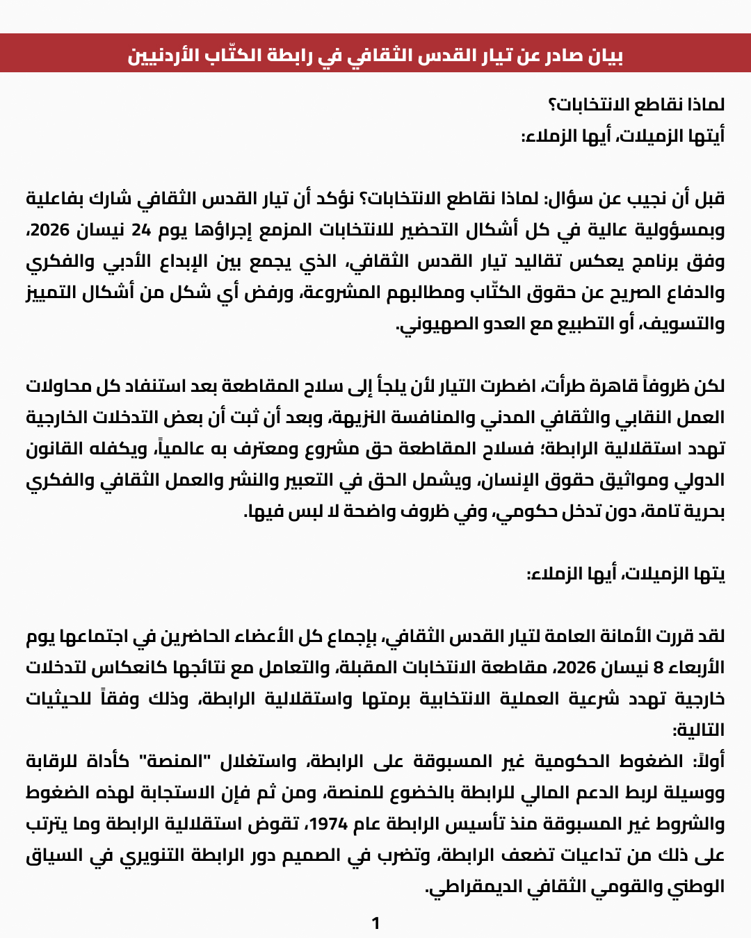 لقد قررت الأمانة العامة لتيار القدس الثقافي، بإجماع كل الأعضاء الحاضرين في اجتماعها يوم الأربعاء 8 نيسان 2026، مقاطعة الانتخابات المقبلة، والتعامل مع نتائجها كانعكاس لتدخلات خارجية تهدد شرعية العملية الانتخابية برمتها واستقلالية الرابطة، وذلك وفقاً للحيثيات التالية: