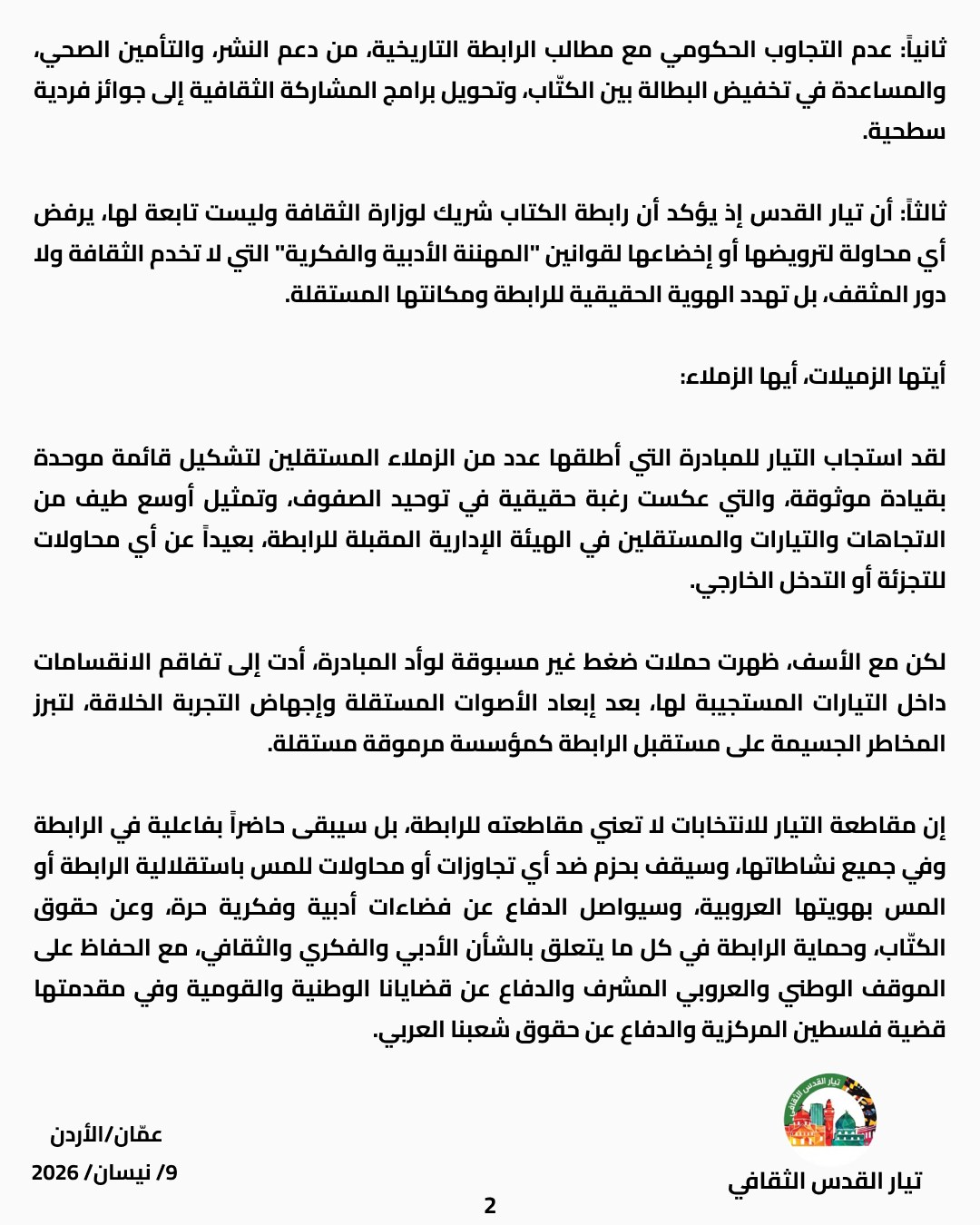 ثالثاً: أن تيار القدس إذ يؤكد أن رابطة الكتاب شريك لوزارة الثقافة وليست تابعة لها، يرفض أي محاولة لترويضها أو إخضاعها لقوانين "المهننة الأدبية والفكرية" التي لا تخدم الثقافة ولا دور المثقف، بل تهدد الهوية الحقيقية للرابطة ومكانتها المستقلة.