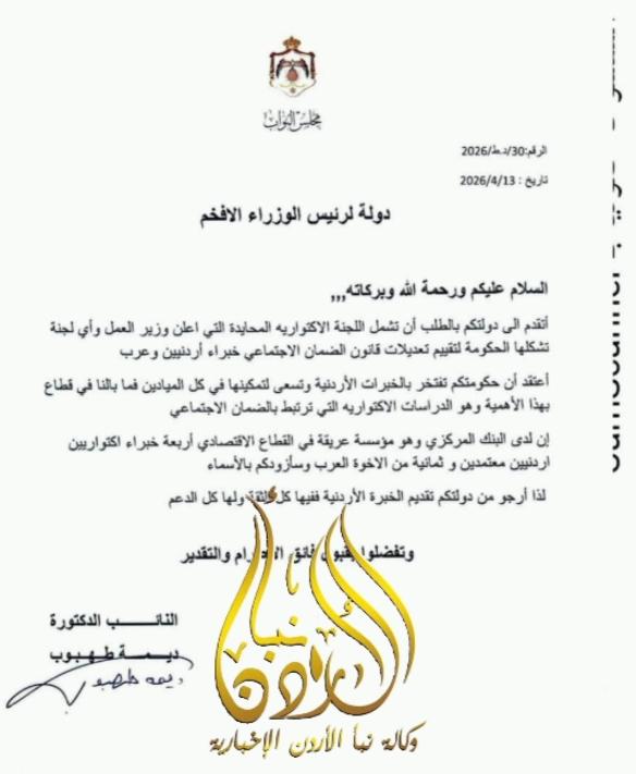 طهبوب لرئيس الوزراء: خبرات أردنية مؤهلة لتقييم "الضمان" وتجاهلها يثير التساؤلات