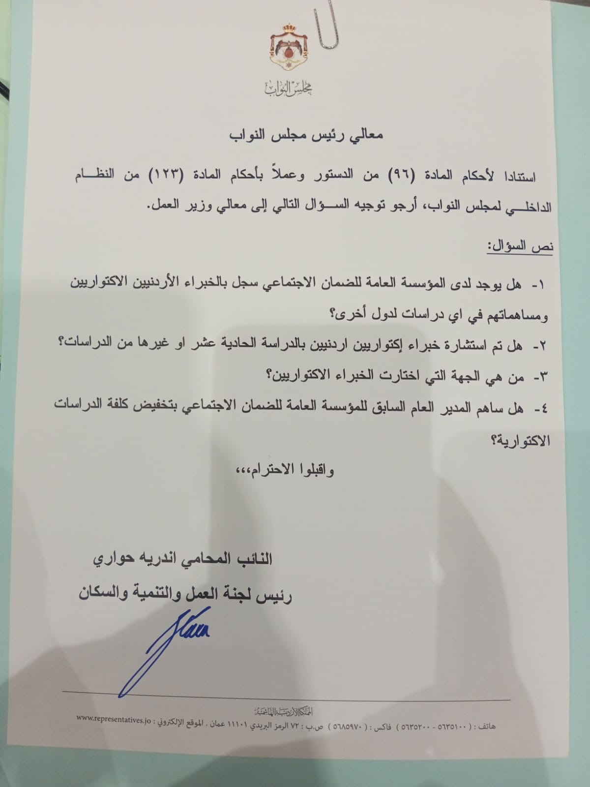 وتضمّن السؤال عدة محاور رئيسية، أبرزها الاستفسار عن وجود سجل لدى المؤسسة العامة للضمان الاجتماعي للخبراء الاكتواريين الأردنيين، ومدى مشاركتهم في إعداد دراسات محلية أو لدول أخرى، في إشارة إلى أهمية الاستفادة من الكفاءات الوطنية في هذا المجال.