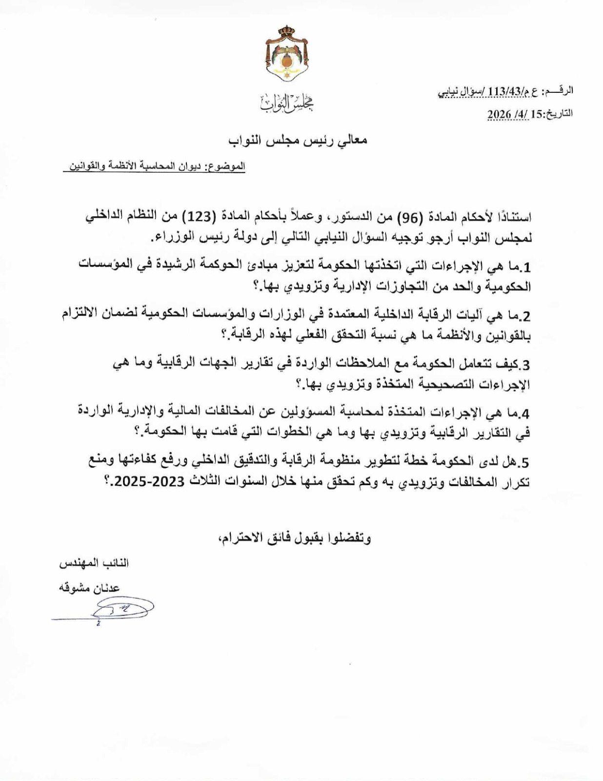 استنادًا لأحكام المادة (96) من الدستور، وعملاً بأحكام المادة (123) من النظام الداخلي لمجلس النواب أرجو توجيه السؤال النيابي التالي إلى دولة رئيس الوزراء.