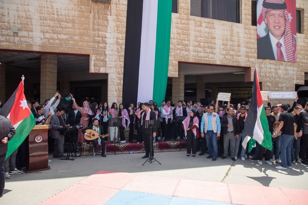 وشهدت الفعاليات ايضاً مشاركة مميزة من موسيقات الأمن العام، التي أضفت أجواءً وطنية حماسية، فيما ازدانت أروقة الجامعة بالأعلام الأردنية في لوحة جسدت وحدة الأردنيين وتلاحمهم، وعكست روح الانتماء الصادق للوطن .