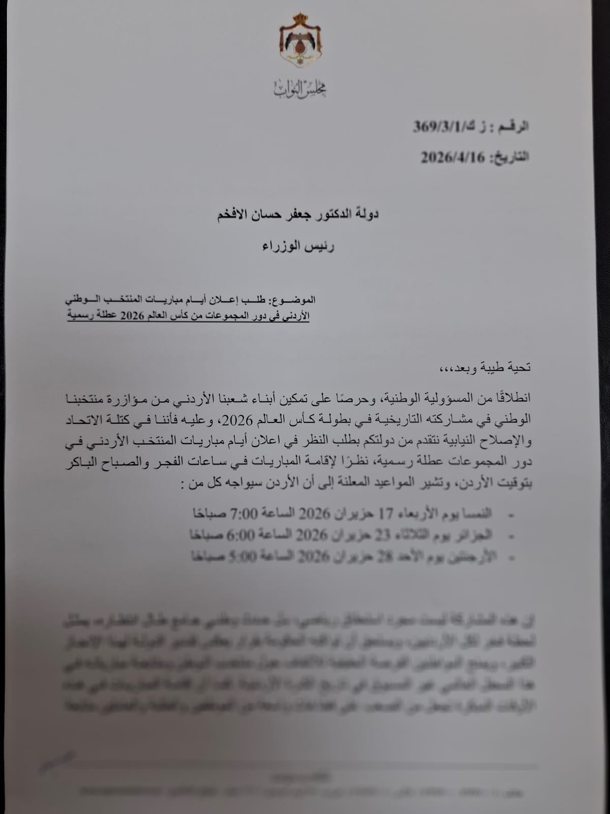 وقال الخشمان، في مذكرة رسمية موجهة إلى دولة رئيس الوزراء الدكتور جعفر حسان، إن هذا الطلب ينطلق من مسؤولية وطنية صادقة، ومن إدراك عميق لحجم الفرح الشعبي الذي يعيشه الأردنيون وهم يترقبون ظهور منتخبهم الوطني في نهائيات كأس العالم، بعد انتظار طويل لهذا الإنجاز الذي شكّل لحظة فخر واعتزاز لكل بيت أردني.